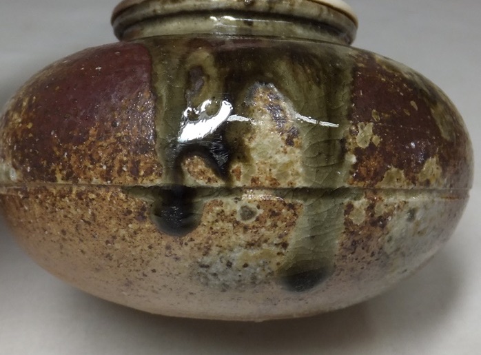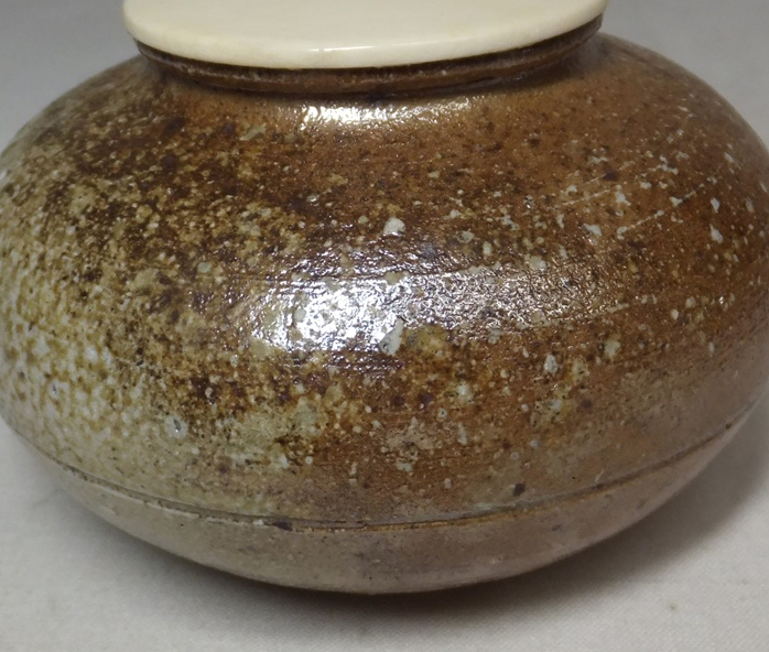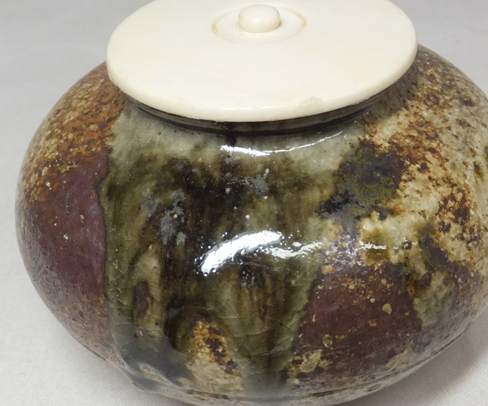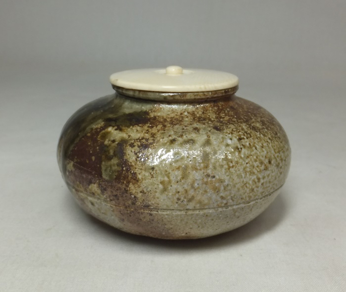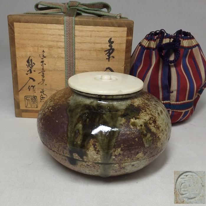 Here’s an exquisite tea caddy by the renowned artist Honiwa Rakunyû II (1929-2002), who is one of the great acknowledged Shigaraki masters. Originally born in Nagano prefecture, he was trained by the first Rakunyû and succeeded his name in 1963.