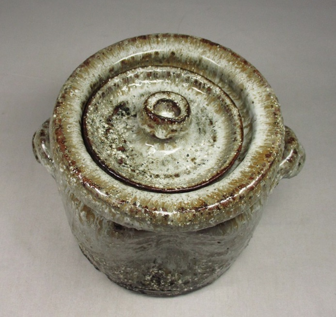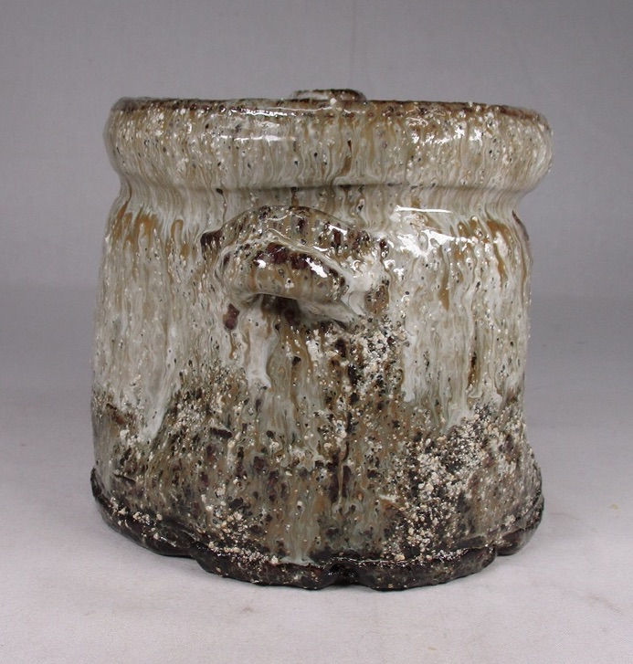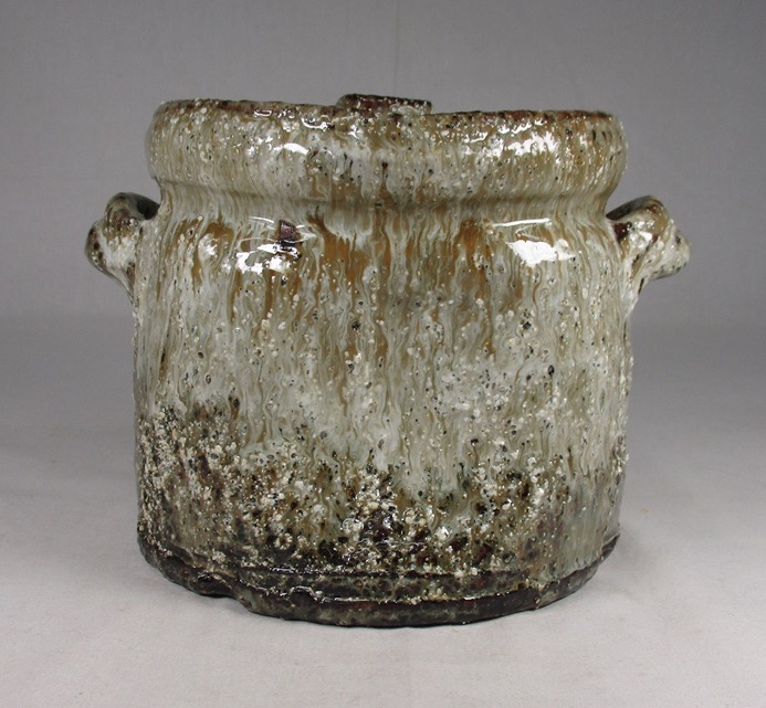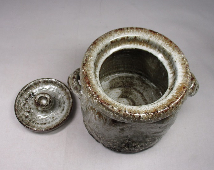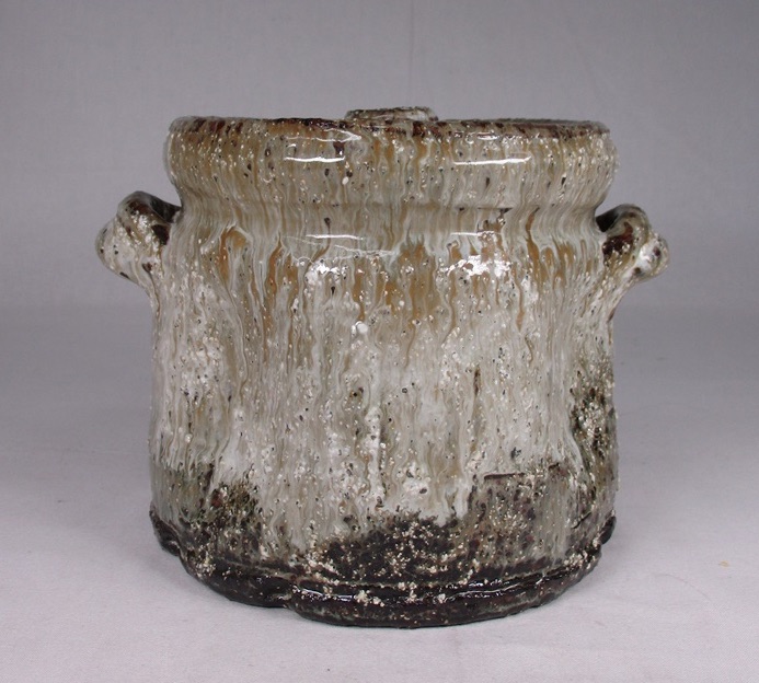 Here’s a mizusashi or fresh water pot used in the tea ceremony made by Mashita Takashi in one of his signature glazes. He is a potter who works freely in the world of Hagi ware yet incorporates his own artistic vision on his work. The amount of detail in the glaze of this pot and the lid, pooling in the deepest cracks and crevices is a pleasure for the eyes and the careful explorer will be rewarded by the differences in texture. You will be delighted by this exquisite object.