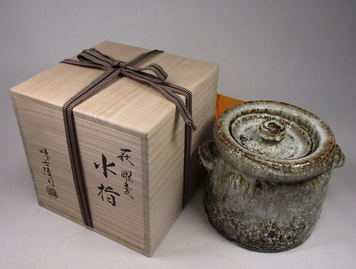 The mizusashi has no chips or cracks and is in mint condition. Comes with the original high quality shiho-san paulownia tomobako or storage box that has calligraphy and stamp of authenticity plus a dedicated tomonuno or tea cloth. An impressive Hagi piece, complete with accessories.