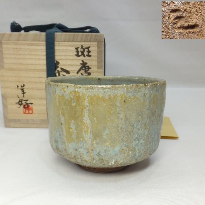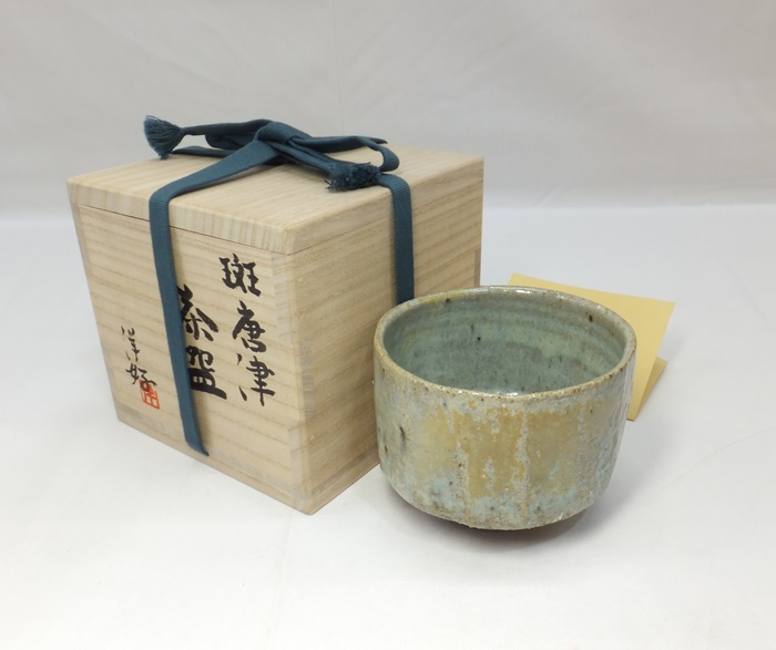 Karatsu-yaki is one of Japan’s oldest and most revered styles of ceramics used in daily life and later in history the development of the Tea Ceremony. Karatsu pottery originates in what is nowadays Saga prefecture. As the ancient saying goes first Raku, second Hagi and third Karatsu. Among the many different aesthetic characteristics that developed this is an exemplary Madara-garatsu style chawan (斑唐津).