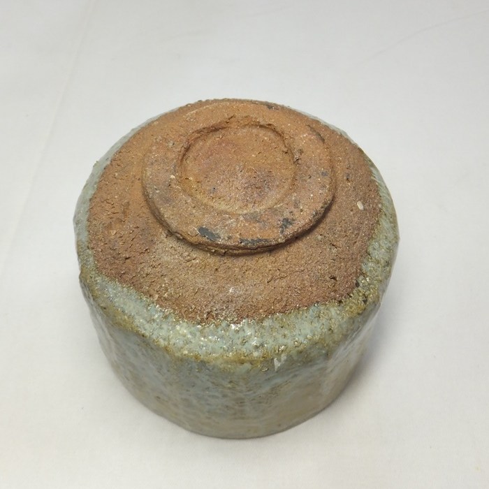Made by the contemporary potter Yoko Hamamoto this is a highly mottled Karatsu chawan. It has an han tsutsu-gata or half cylinder shape which has been chamfered to create the cornered design on which the glaze had the chance to pool in greens and light blue hues. The shape of the koudai or footring can be classified as what is known as a Tokin koudai. Tokin infers the shape is similar to ancient kabuto, Japanese helmets worn by samurai in battle.
