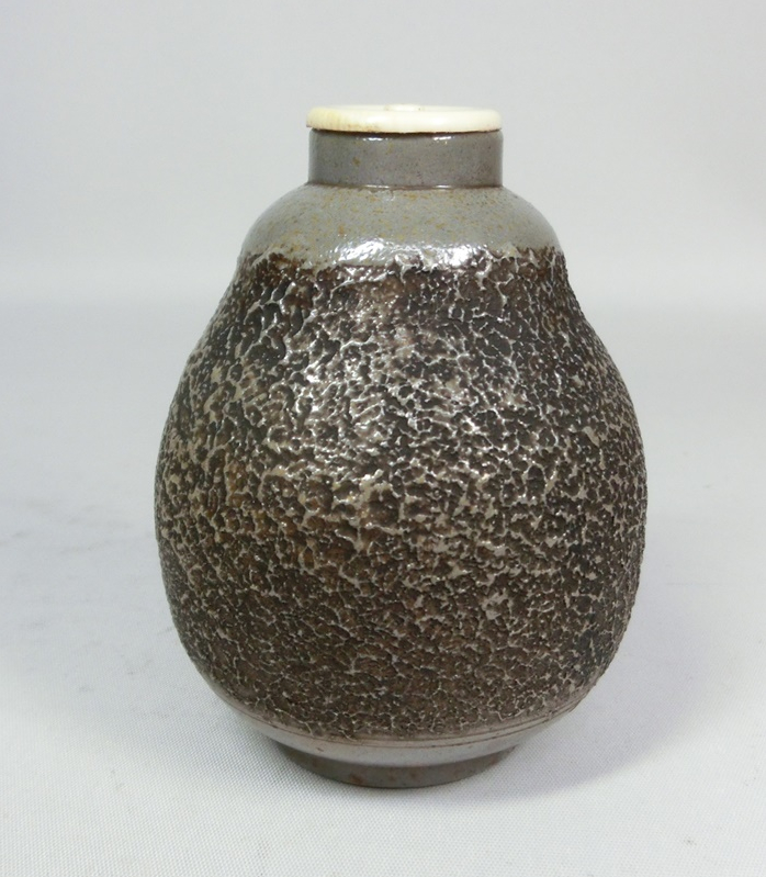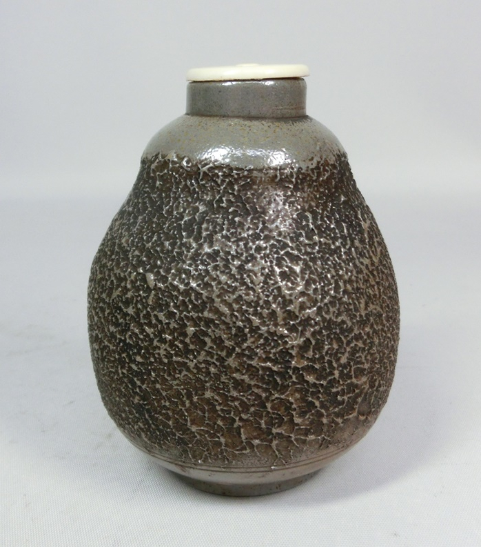 Ao-Bizen can be translated as “blue Bizen”. The ware acquires various blue hues according to the amount of reduction, from light blue (heavy reduction), to brownish (lighter reduction). The method is almost the same as that of “hidasuki”. But at the end of the firing, charcoal is placed on top of the saggars, completely covering them. The burning charcoal consumes the oxygen in the kiln creating a strong local reduction atmosphere. So the only difference between red (hidasuki), and blue is the oxygen concentration during the firing. It is very difficult to control all of the elements needed to create “blue Bizen”, so this colour is very rare and prized by connoisseurs.
