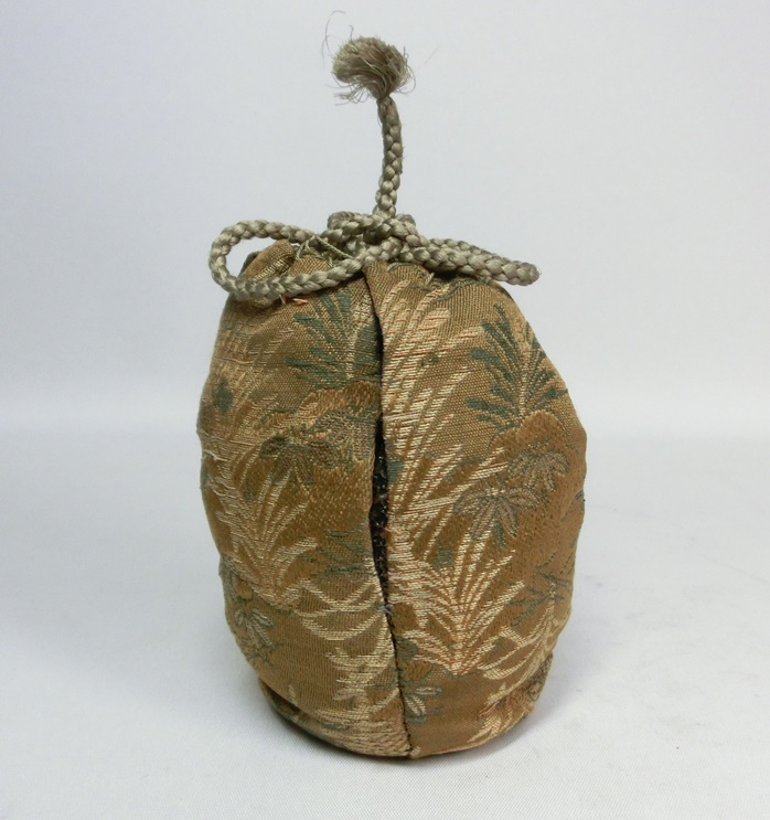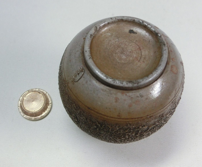 When inspected it is clear that this ao Bizen or blue Bizen tea caddy is old, in all likelihood well over a hundred years. A conservative estimate would be early Meiji period, end of the Edo period. Perhaps even older. Featuring a bulbous, feminine shape not too often seen in tea caddies or Bizen ware in general. The exterior of the caddy is decorated with several groves over a unique surface pattern called ishime, a texture mimicking stone ground. The shape is reminiscent of a type of gourd called a hyotan, which were grown by farmers and historically used as water bottles and a number of other purposes. A subject shown in many of the arts that flourished in Japan. Hyotan are objects that have for ages been the subject of superstitions and frequently appear in Japanese folklore. If for instance, 6 gourds came together, it would be a auspicious sign of (impending), good luck.