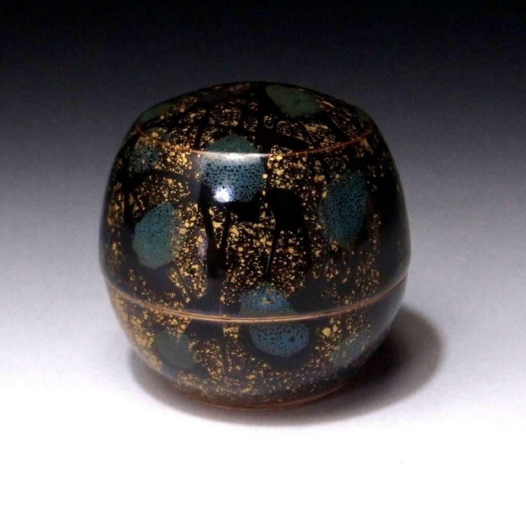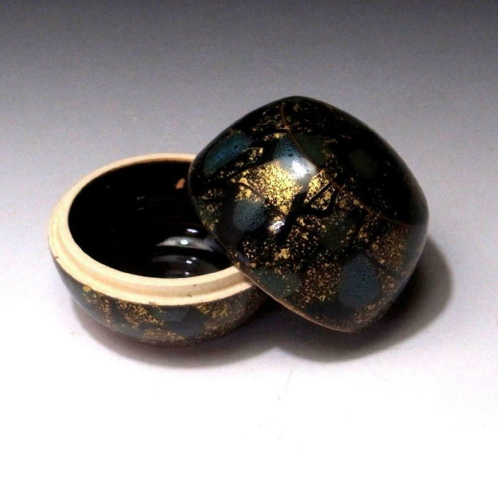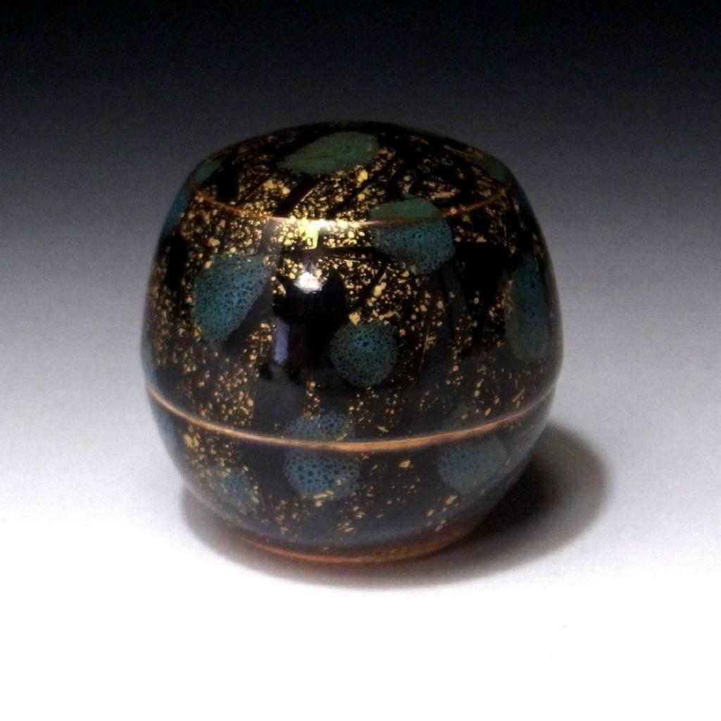 This is a kogo (a holding vessel for incense), by ceramic artist Jun Iwai. Jun Iwai is a ceramic artist who has a kiln called Rikka-gama in the suburb of Sendai-shi. His work is a unique adaptation of Rikka tenmoku-yu chawan. He studied crystal and tenmoku oil-spot glazes and he creates pieces that are breathtakingly beautiful. The standout characteristic of his pieces is the pattern that shines likes stars on the plates. Currently, he is working on a new technique to produce crystal glaze by controlling temperature. His flexibility and desire to pursue new things may be a result of his many experiences.