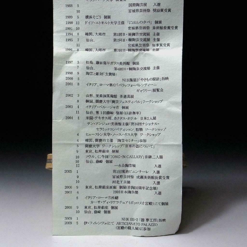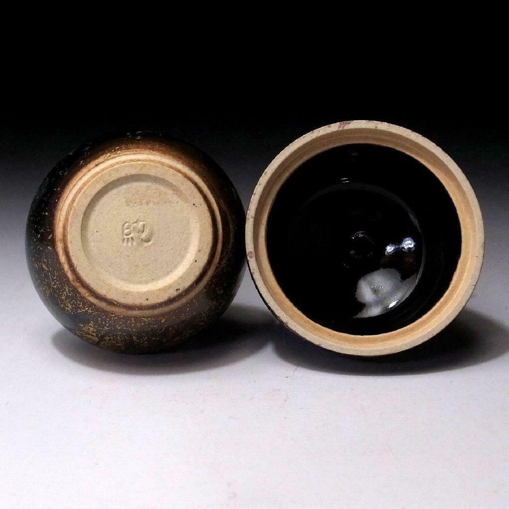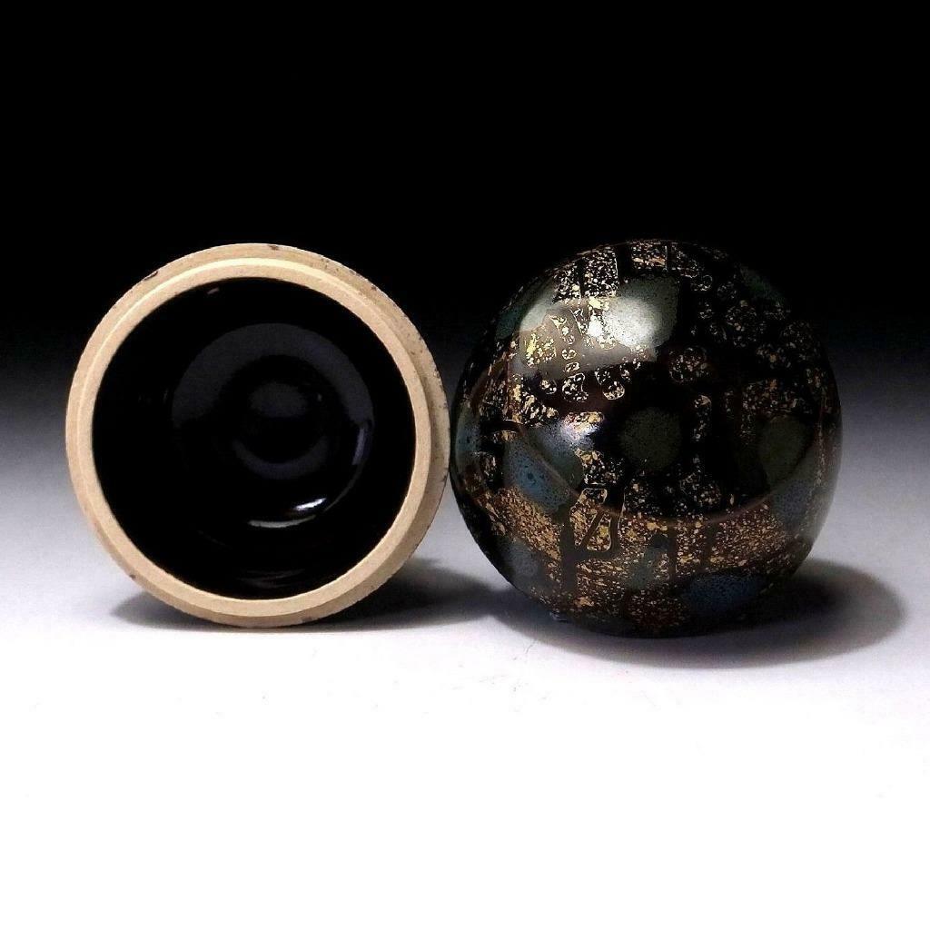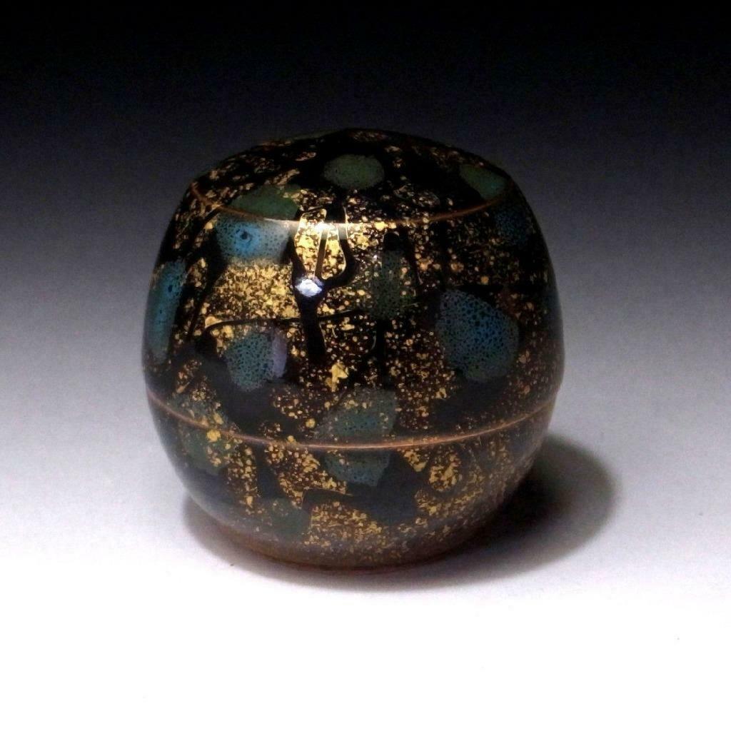 This is a kogo (a holding vessel for incense), by ceramic artist Jun Iwai. Jun Iwai is a ceramic artist who has a kiln called Rikka-gama in the suburb of Sendai-shi. His work is a unique adaptation of Rikka tenmoku-yu chawan. He studied crystal and tenmoku oil-spot glazes and he creates pieces that are breathtakingly beautiful. The standout characteristic of his pieces is the pattern that shines likes stars on the plates. Currently, he is working on a new technique to produce crystal glaze by controlling temperature. His flexibility and desire to pursue new things may be a result of his many experiences.