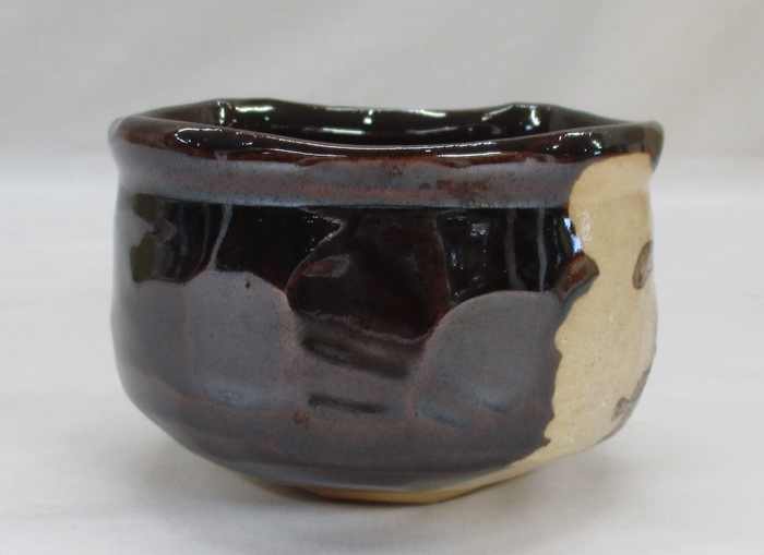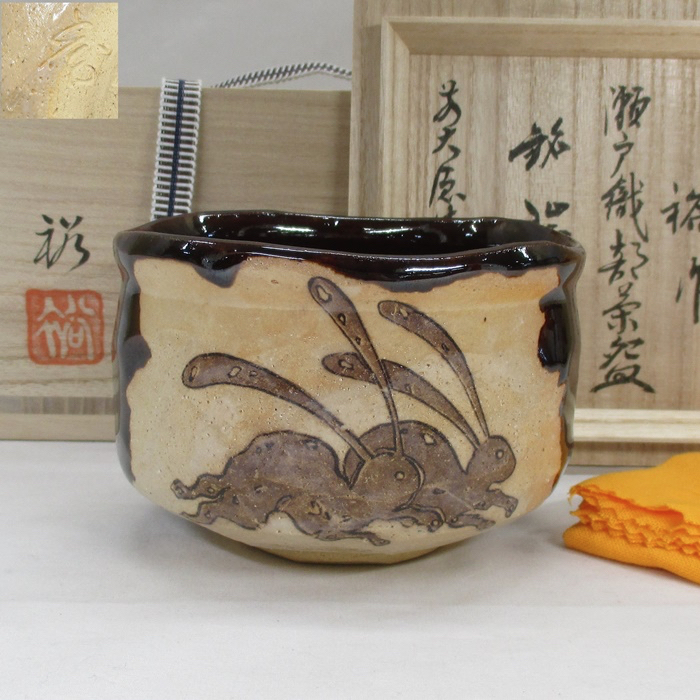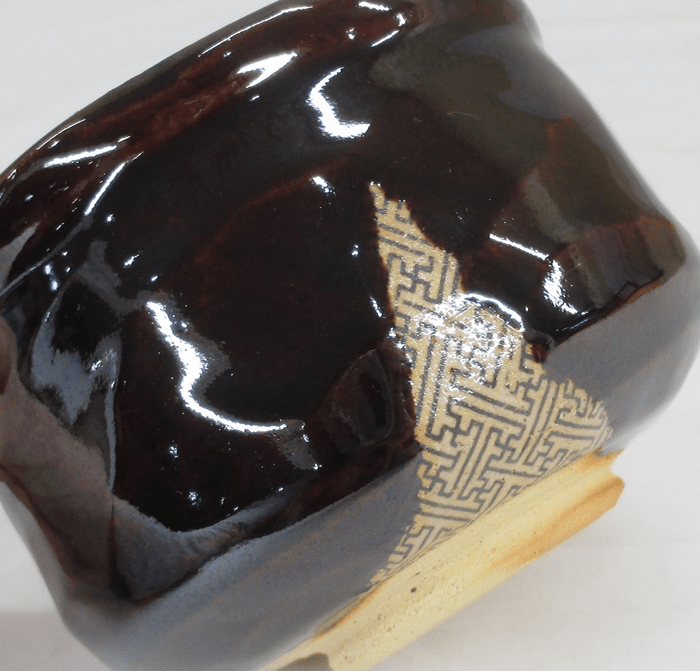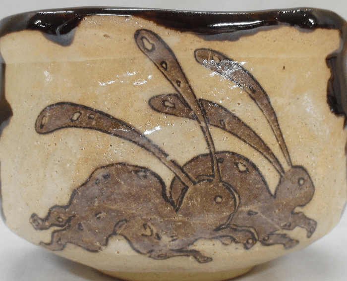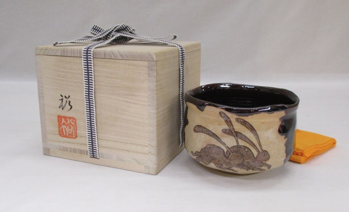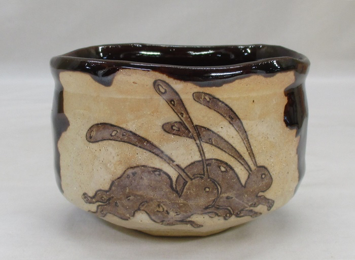 Available for purchase is a formal kuro-Oribe chawan by Yutaka Hatsumi (1950-). Half cylinder shape with chamfered sides. Bearing the expert painting of 2 sprinting hares next to one another. The opposite side is adorned by a traditionally Japanese pattern of intertwining swastika or manji. This chawan features a soft and rich brown glaze which is quite different from the more often seen pitch black. This is due to a lack of manganese in the glaze which is rare to find on Oribe chawan. This chawan is a real jewel that will enrich any collection.