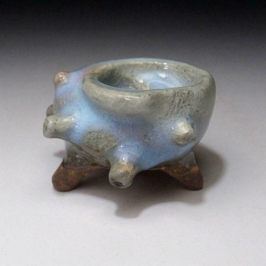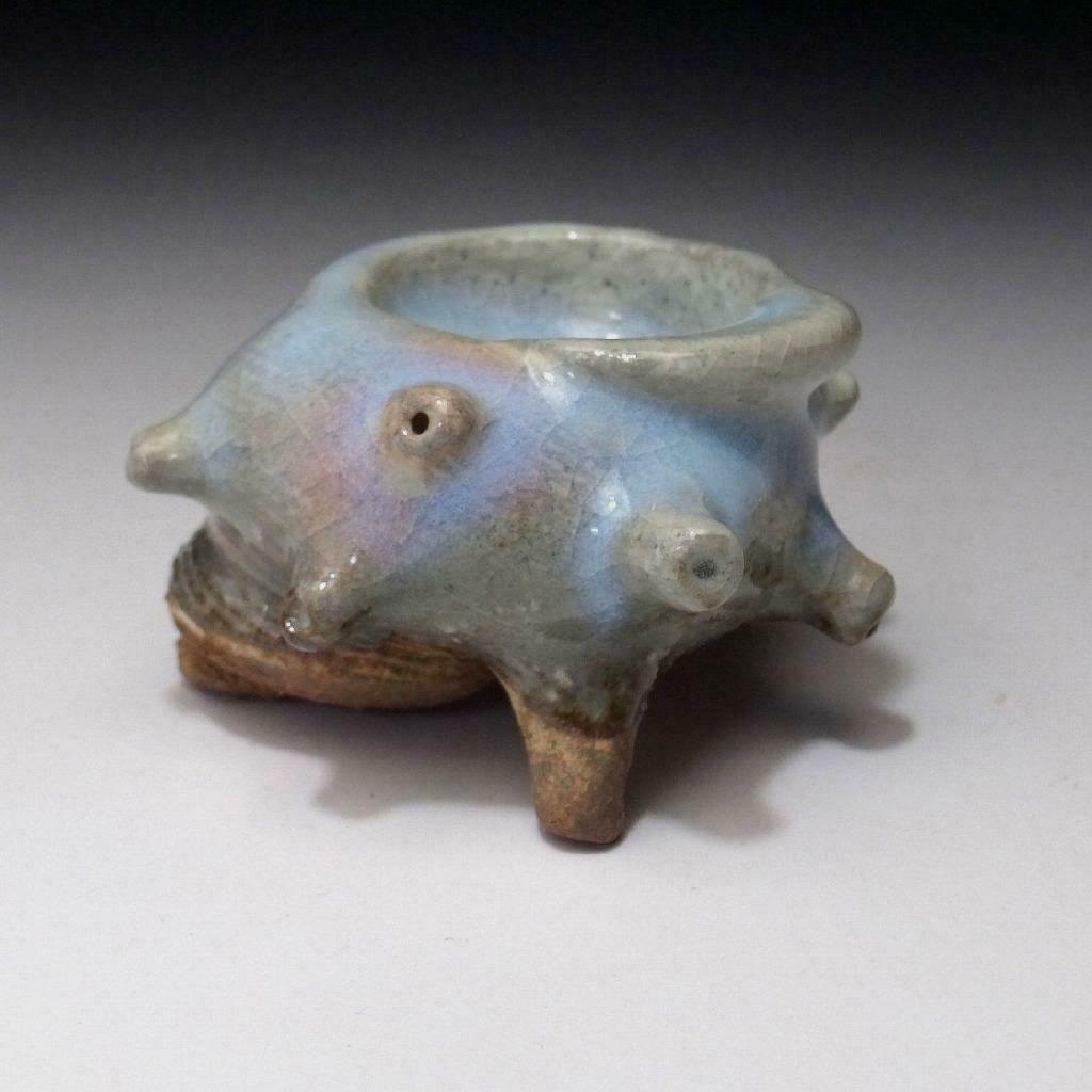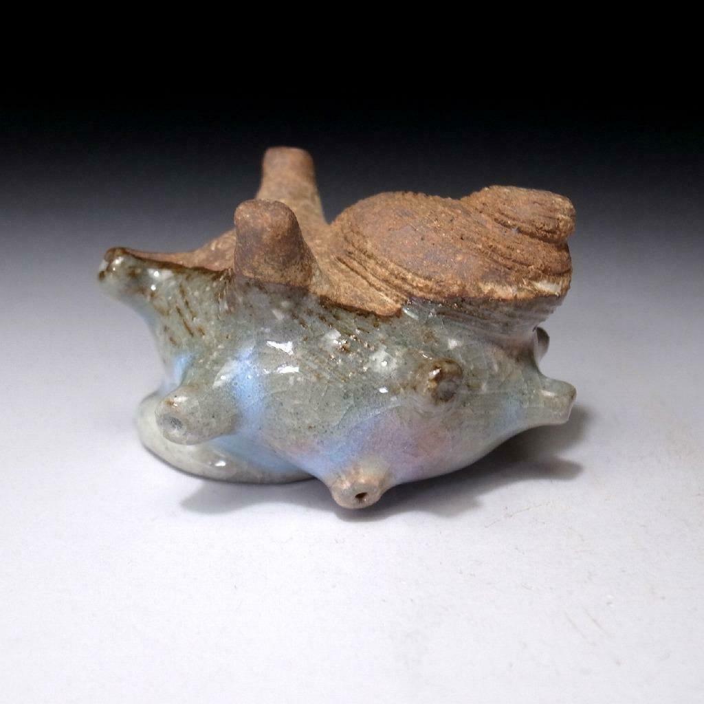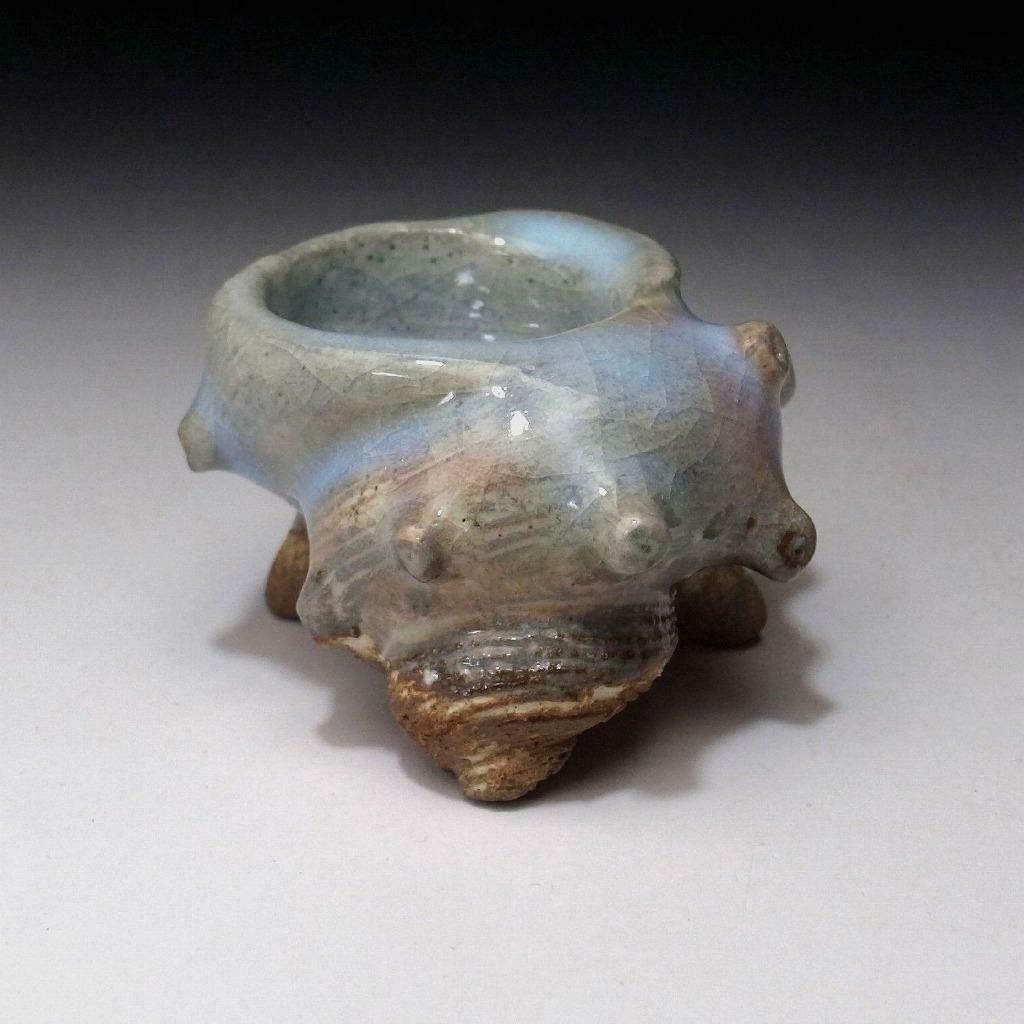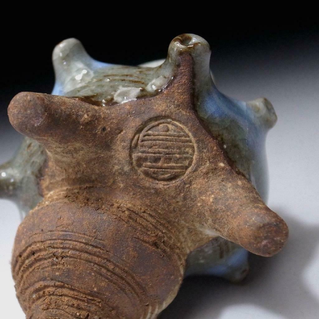 Susumu has created the Hagi blue, a wonderful glaze that this shell futaoki seems to be wearing like a light robe of silk. The sensuality of its touch contrasts with the angular shape of the turban-shell, which is accentuated by the cyan highlights to create a ceramic gem.