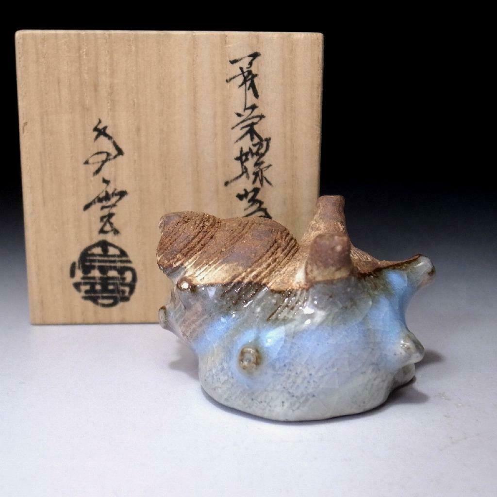 This is a futaoki or lid-rest for use during Chanoyu made by famous potter and kiln owner Noutomi (Notomi), Choun. The futaoki is shaped like a Turban-shell and glazed in his original blue glaze. Noutomi Susumu is the current owner of the Choun kiln. He exhibits frequently and has won numerous awards and prizes. He also holds the title Intangible Cultural Asset of Yamaguchi Prefecture.