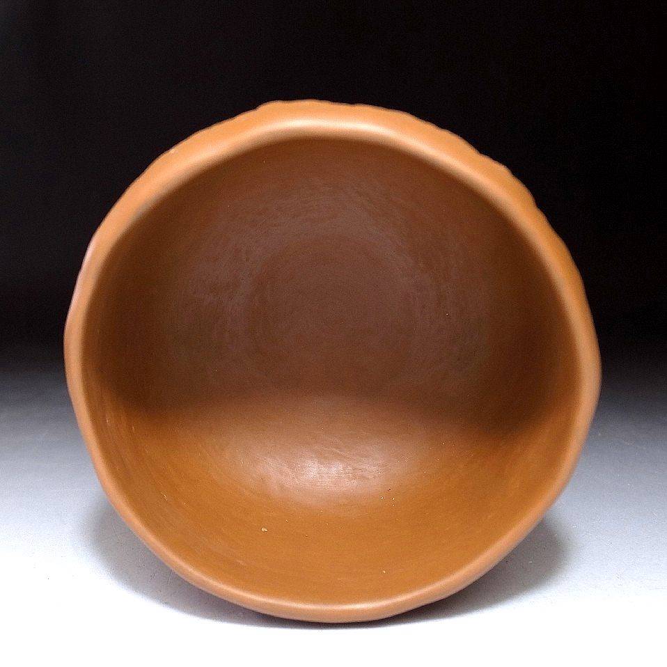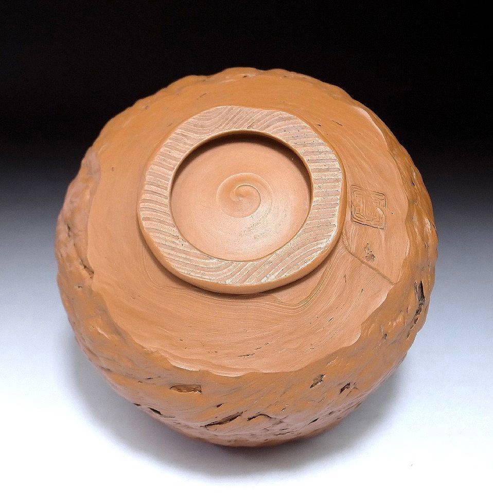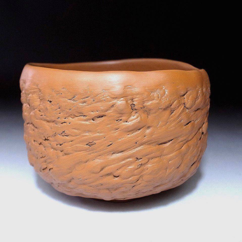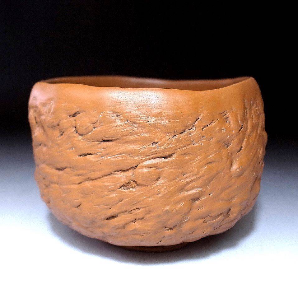 This is a dynamic chawan by (retired), Tokoname craftsman Tsuzuki Hisashi (1939-), who’s artist name was Tougen. Half cylinder shape where the exterior has been sculpted to appear like tree roots, going over and under. The inside has been made smooth by use of a piece of leather. Most likely fired in one of the many climbing kilns of Tokoname. This type of clay is called shudei and is one of the hallmarks of Tokoname pottery.