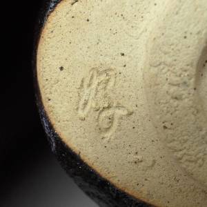 Many are cylindrical in shape and are made at an incredibly low elevation. The lacquer is done in the style of Oni-ita where ash is mixed in, and when removed from the 1100℃ kiln with a pair of metal tongs, rapid cooling causes the colour to turn black (rapid cooling is sometimes also achieved with water). The tongs leave a mark which is one of the traits of this style.