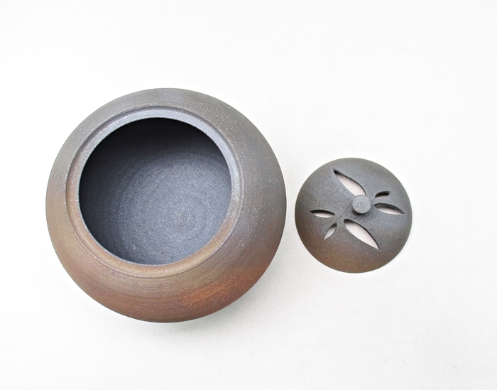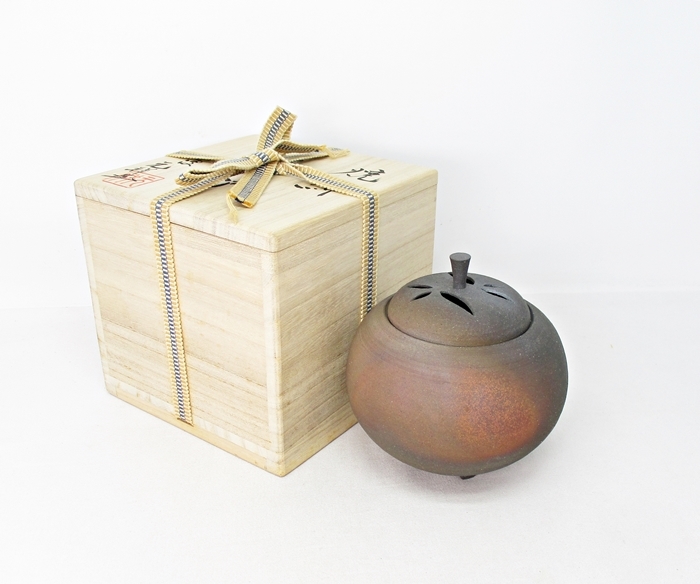 This incense burner is brand new and has not been used. It comes with the original quality paulownia tomobako with kiln stamp & calligraphy on the lid and a dedicated tomonuno (tea cloth), with his seal.