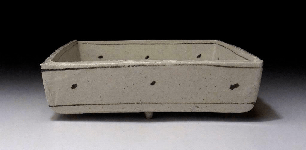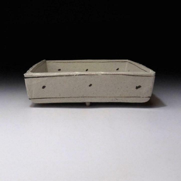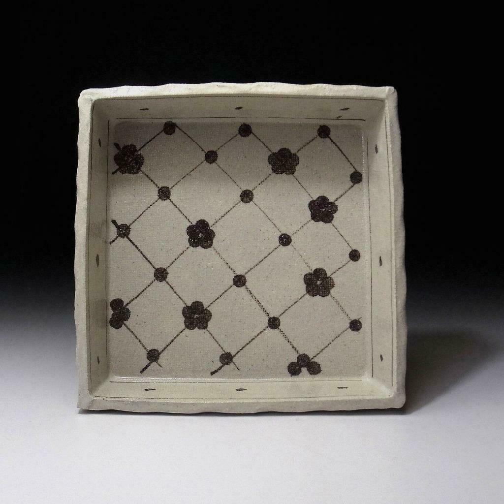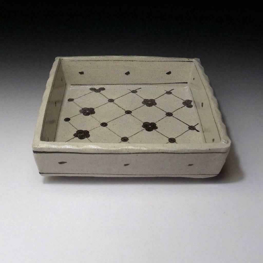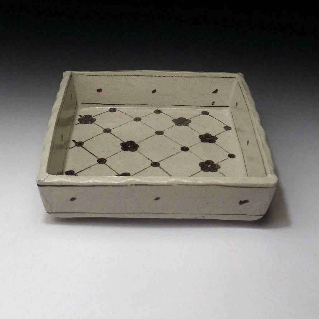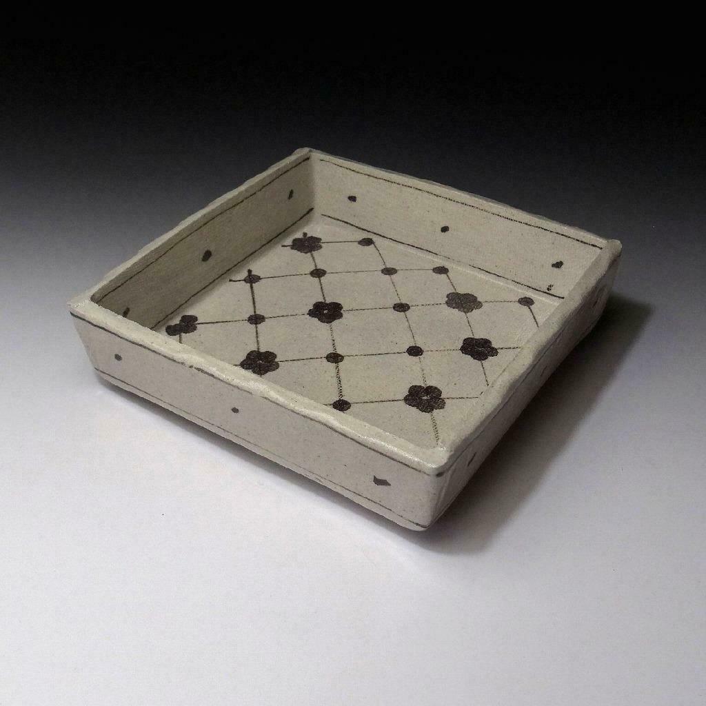 This is a kashiki or presentation platter by famed Nitten exhibition potter Masaru Kamei (1933-). Masaru Kamei is a potter working in the Seto style which is centered around Seto City in modern day Aichi prefecture. This item has a nezumi or gray glaze and a seemingly simple design of flowers on a diamond motive. On closer inspection, through its simplicity it gives off a sense of sophistication, less is more in this case. It sits on 3 small legs keeping it stable even when a surface is uneven. Using unique and handmade utensils like this one can change the atmosphere and your perception of it when displayed in your home or using it in your own personalized ritual, be it in a formal gathering or just a afternoon snack.