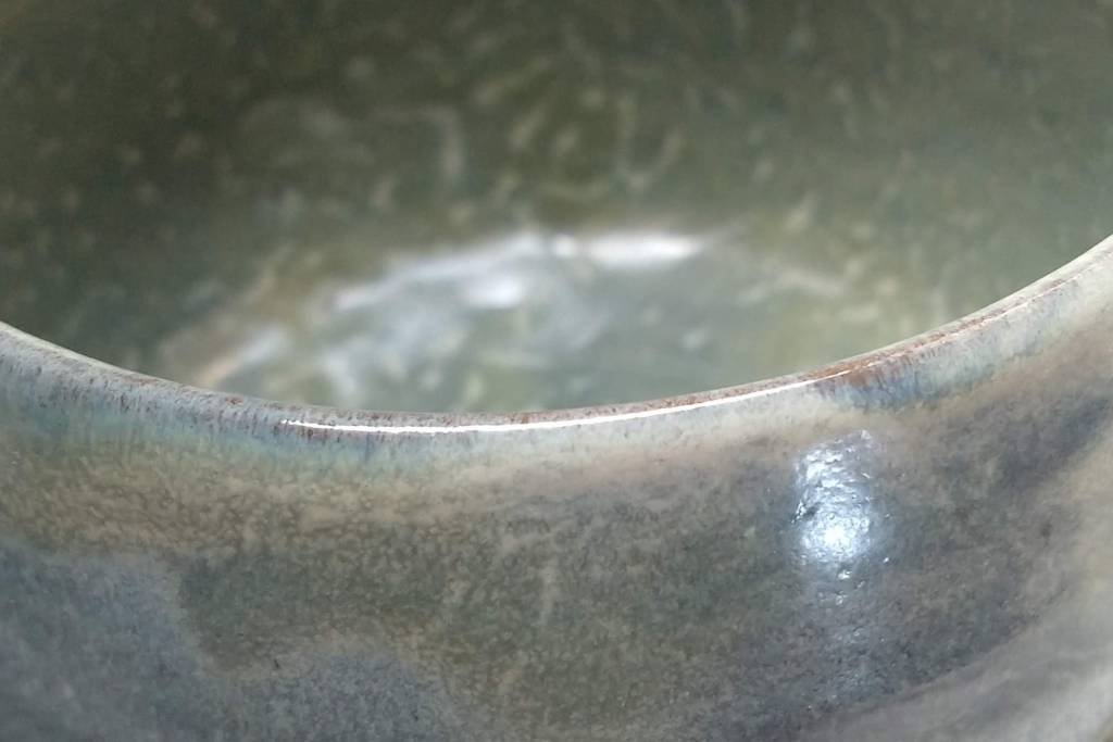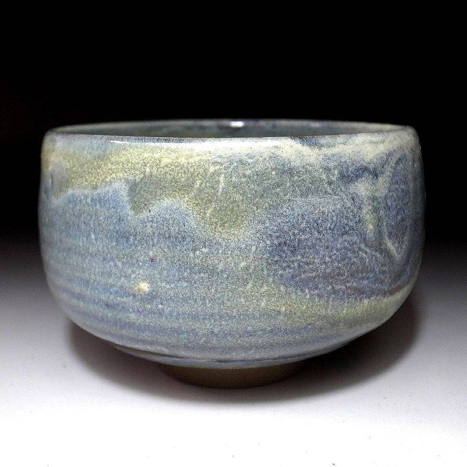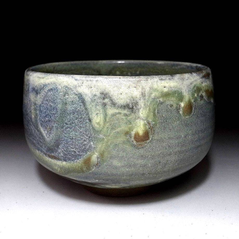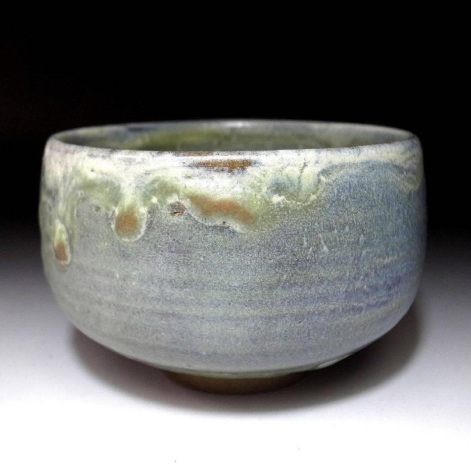 This special chawan was made in the village of Onta, which is found in the vicinity of Hita City, Oita prefecture, Japan. Half cylinder shape and thrown on a wheel, this bowl has a one of a kind ash glaze with much variation in colour, gradation and density throughout. A unique piece from this special village. From the aged box my estimate would be early Meiji or late Edo period. Most Onta ware that is made more recently is considerably different from this chawan.
