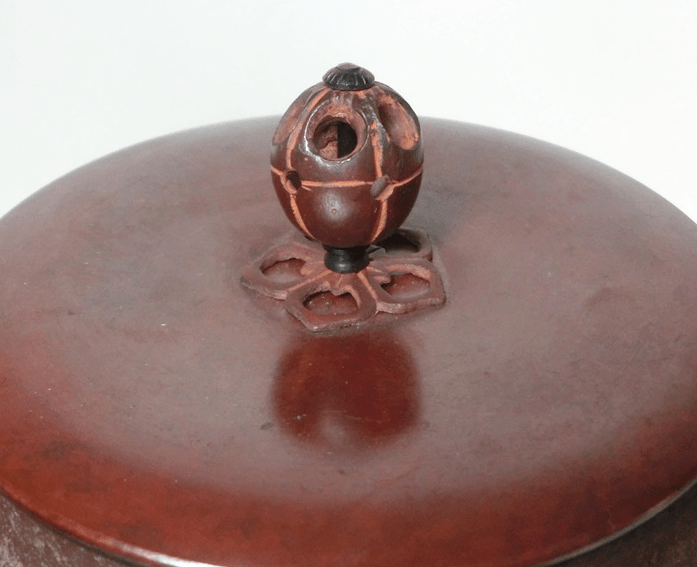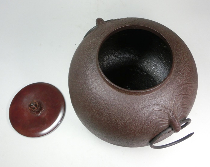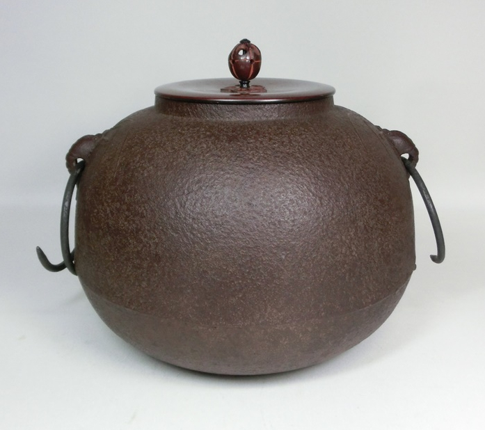 This kettle’s shape is called shinnari-kama, or true shape. It is round and originally had a rim like a belt running around its lower half. These kind of kettles were made in the tradition of kettles of the past. During the Edo period many new and different kettle shapes were created, but the potter’s earlier “true shape” remained the most popular.