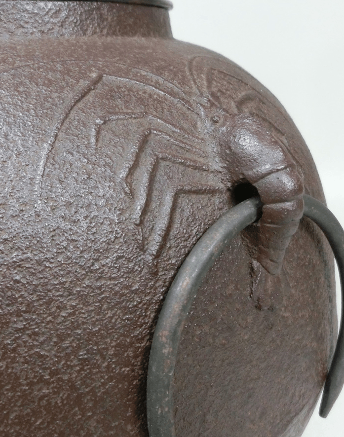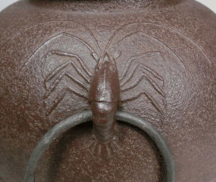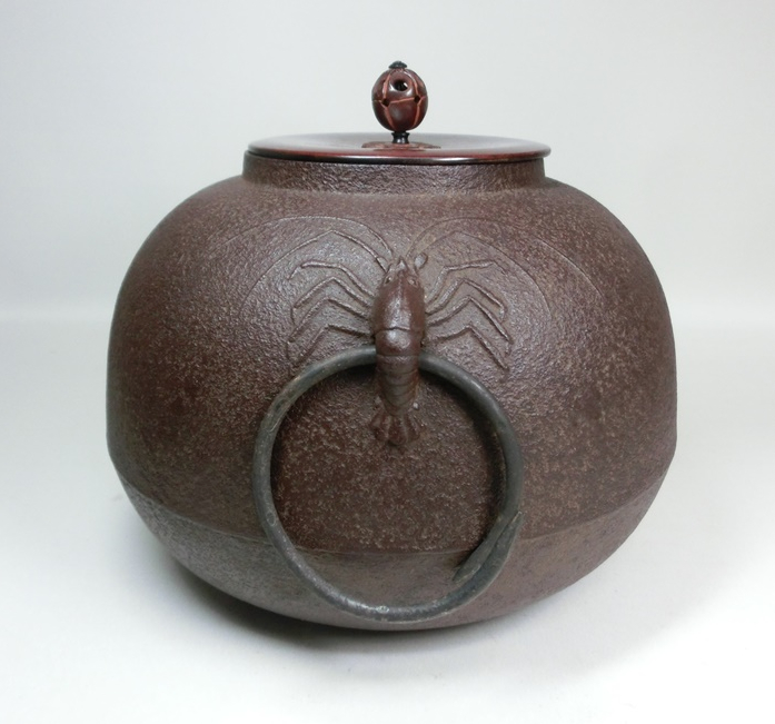 Chagama are made by making a mirror image of the intended shape and design in sheet metal which will then be used to create a mould (together with a counter part that creates the hollow interior), which will receive the hot molten iron. As mentioned, the production moulds deteriorate during use and after a certain number of uses the details of the design will fade and eventually every piece, no matter how good is forcibly discarded. Decorations such the shrimp and ishime surface texture on this kettle are crisp and clearly cast indicating it was created early in the life cycle of the mould.