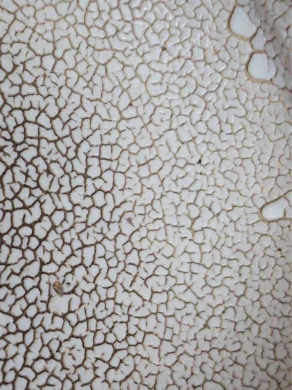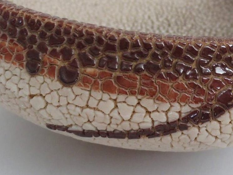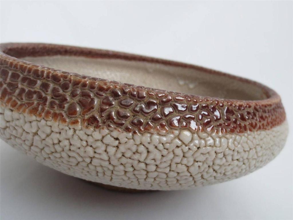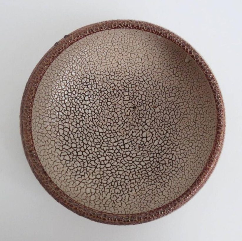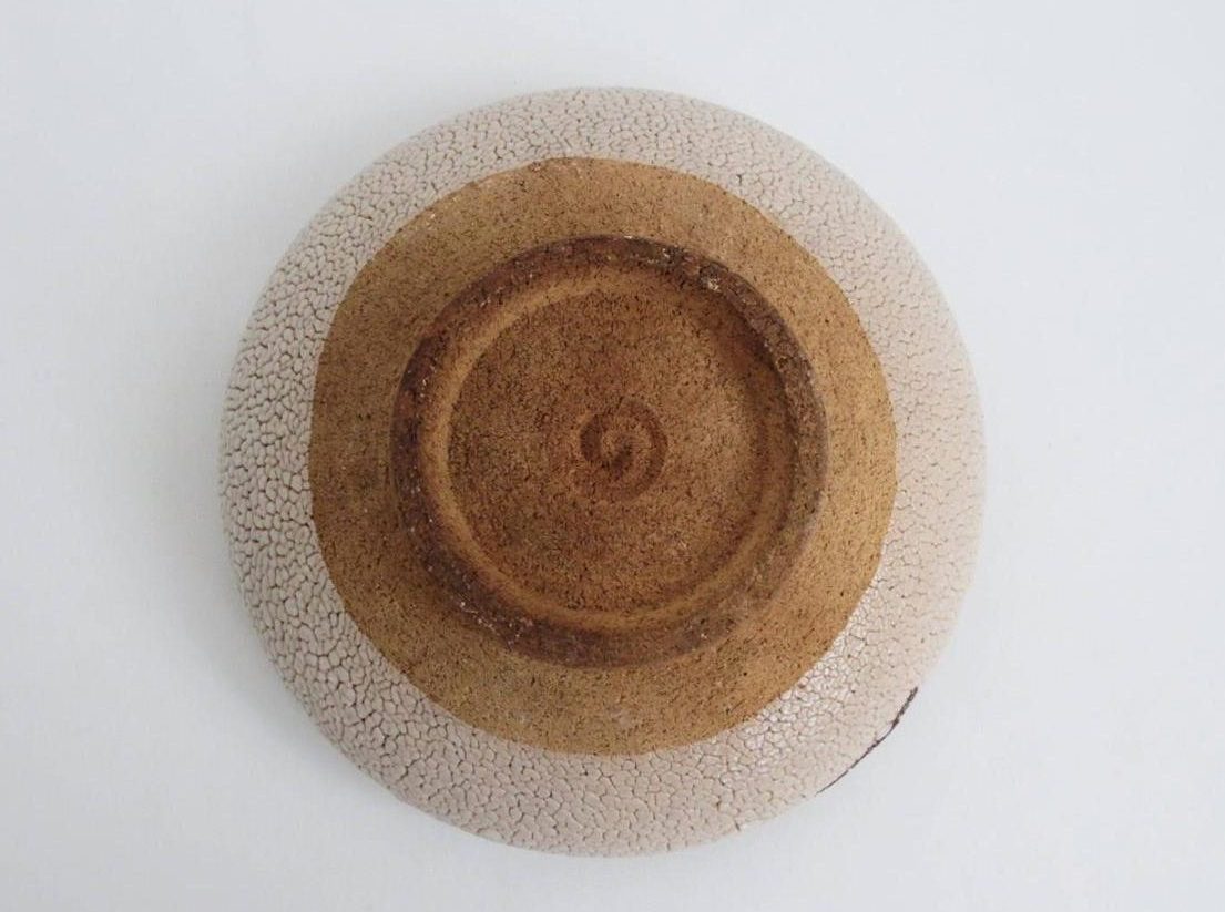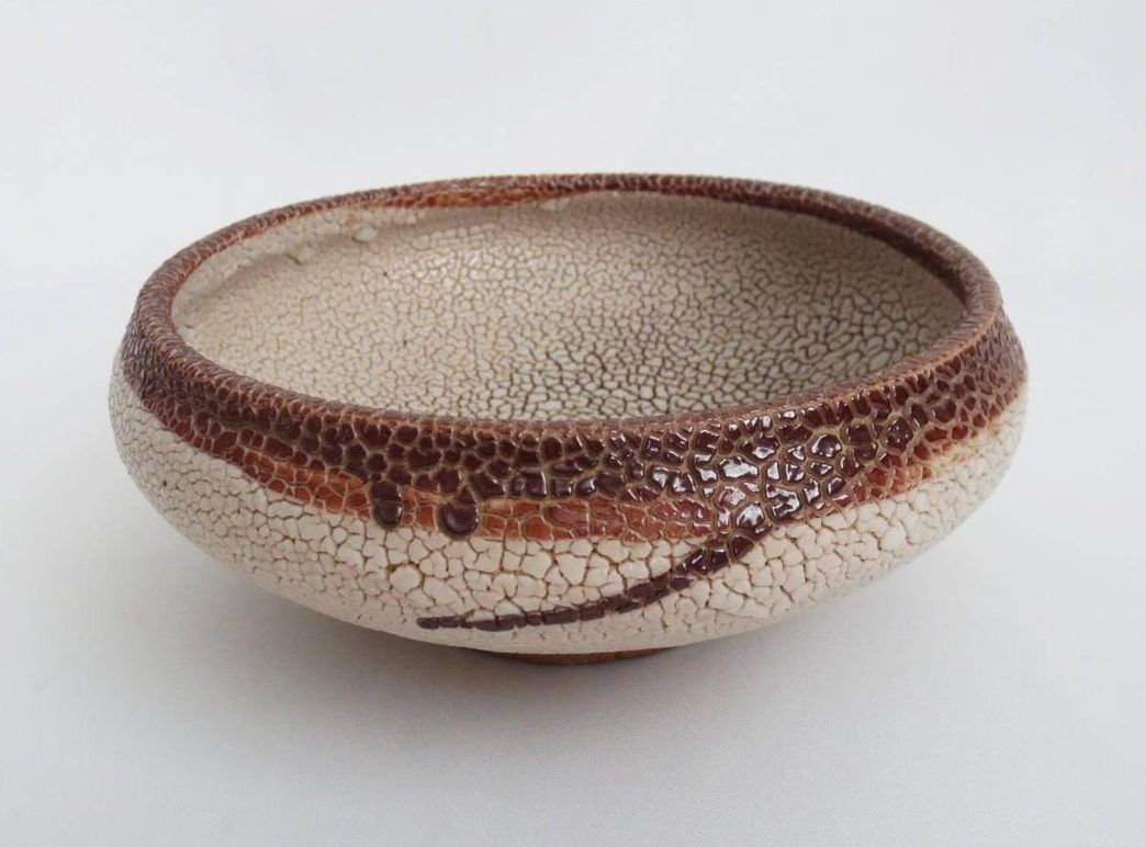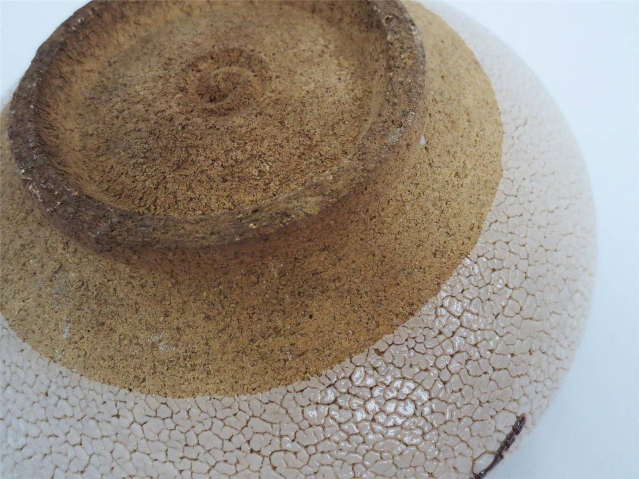 A large wheel thrown Karatsu ware bowl with a outstanding ‘samehada-yu’ glaze, commonly translated to ‘sharkskin texture’ with brushwork near the rim. In Karatsu pottery ware, one of its oldest traits or characteristics is what is commonly described as a dark band around the rim and called ‘kawa-kujira‘. Its origin inextricably linked to Karatsu history. The crawling of the glaze as you are likely well aware of is due to different cooling rates of the clay and constituents of Karatsu glazes.