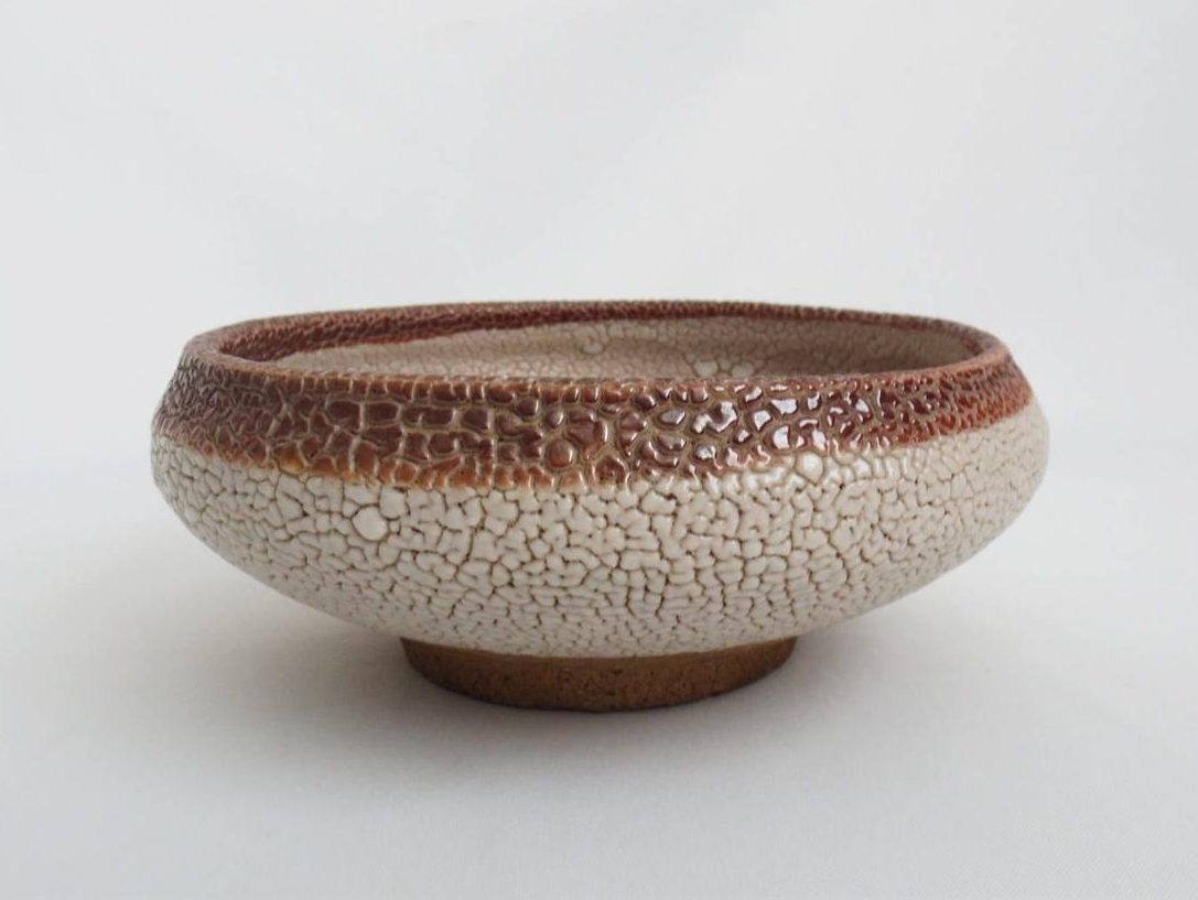 One of the decorative techniques of Karatsu ware. The blackened rim of the vessel’s mouth is painted with iron-based pigment. The name comes from comparing the black of the rim to the skin of a whale (“kujira” is the Japanese word for “whale”, and “kawa” for “skin”), and the colour of the vessel itself to the whale’s body.