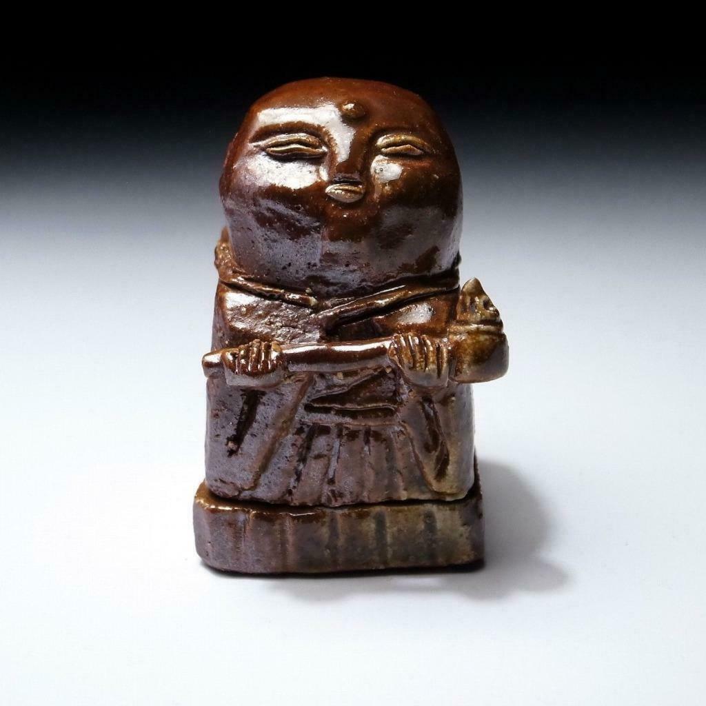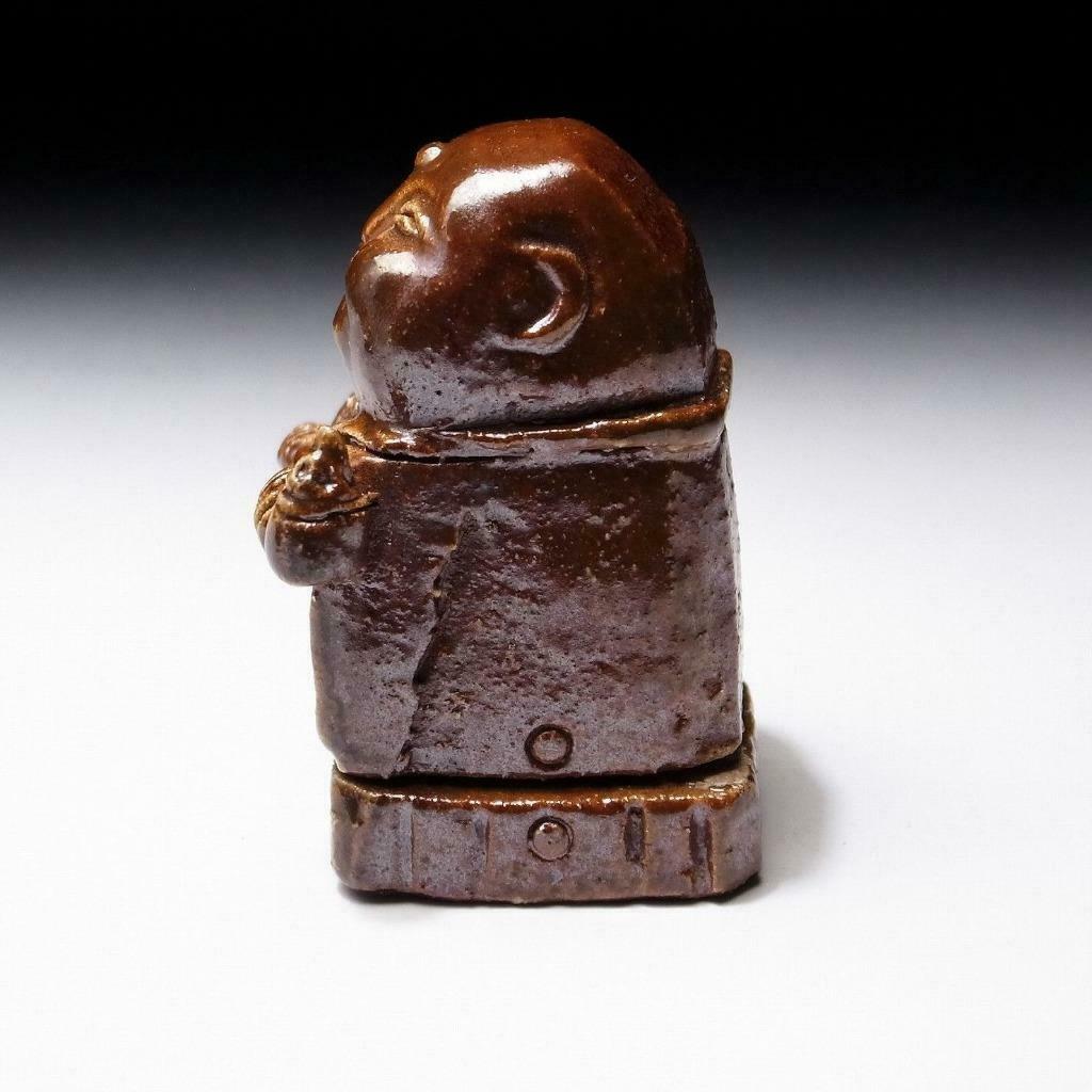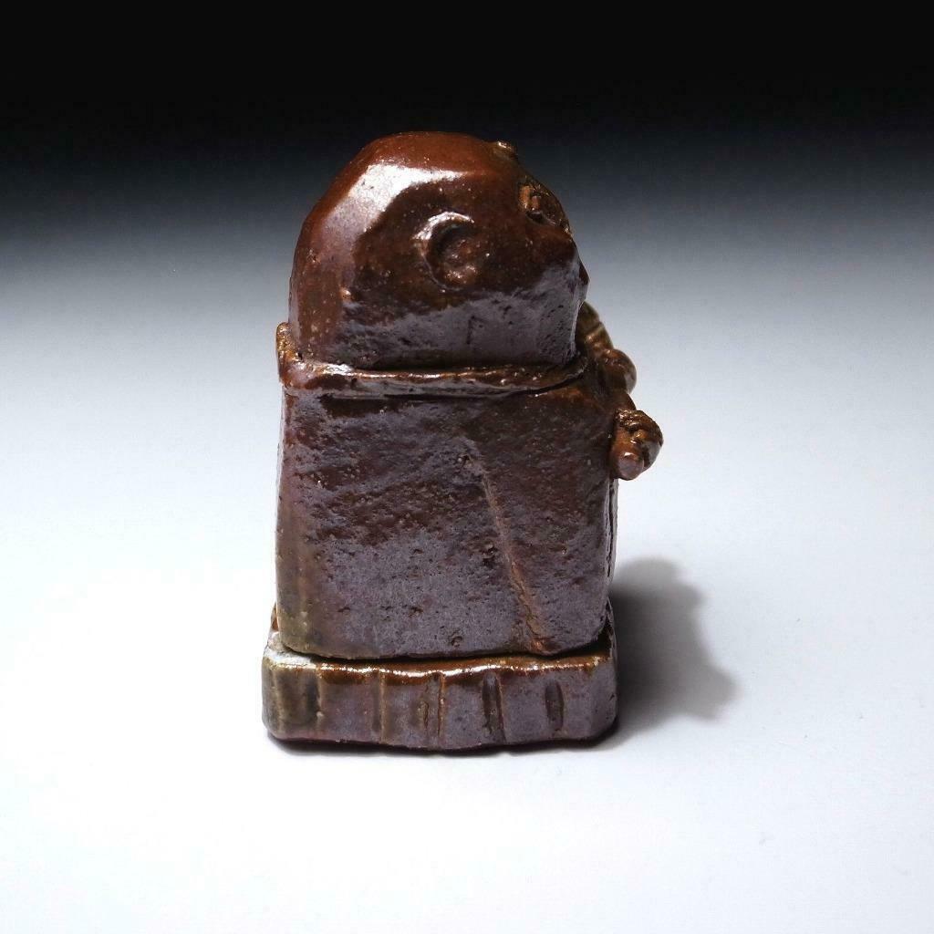 This is a cute kogo or incense case in the shape of monk Jizō (one of the prominent figures in the lore and mythology of Japan), by Kyoto based potter Ryozo Taniguchi (1926-1996). This kogo is quite rare and not many references are available, featuring his early work. Early on he was prolific with a glaze ranging in colour from red to brown, such as the piece here. Later he changed his style to works with blue and green glazes in complex patterns.
