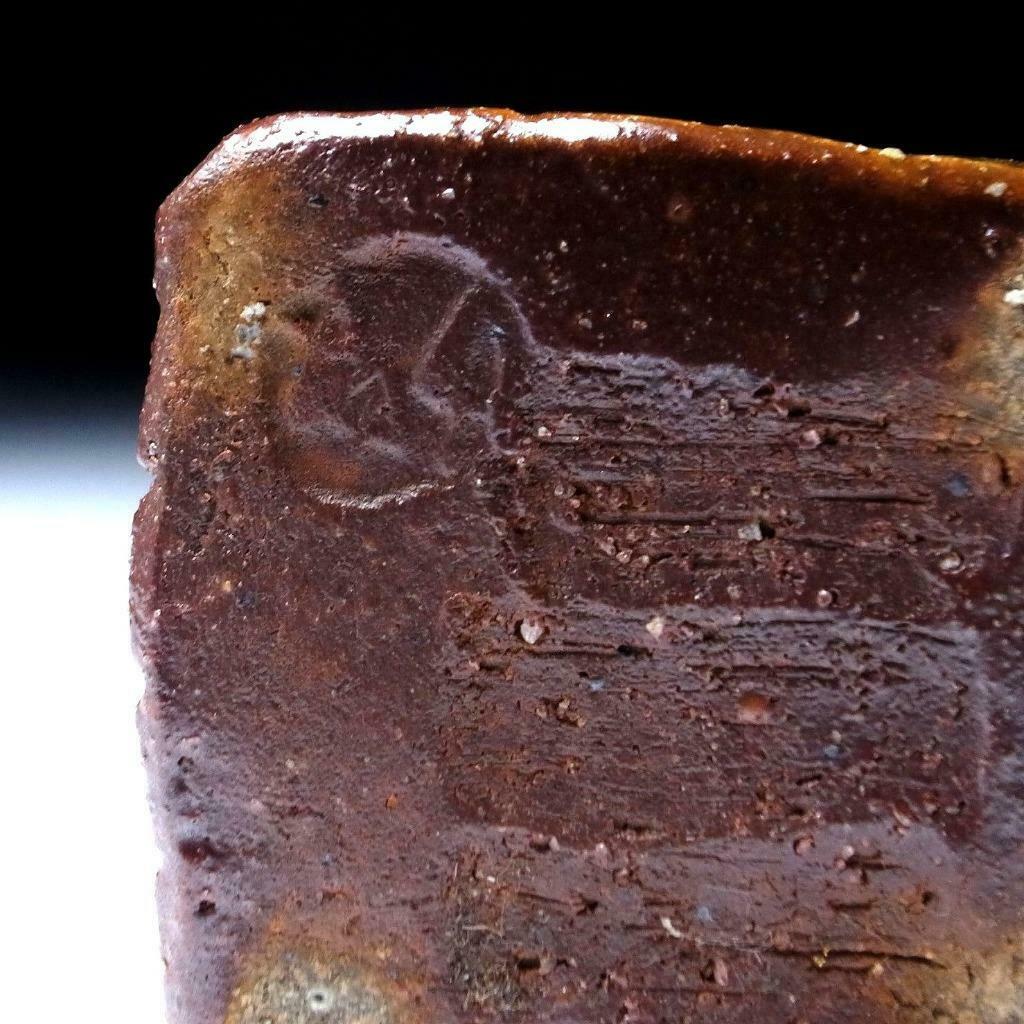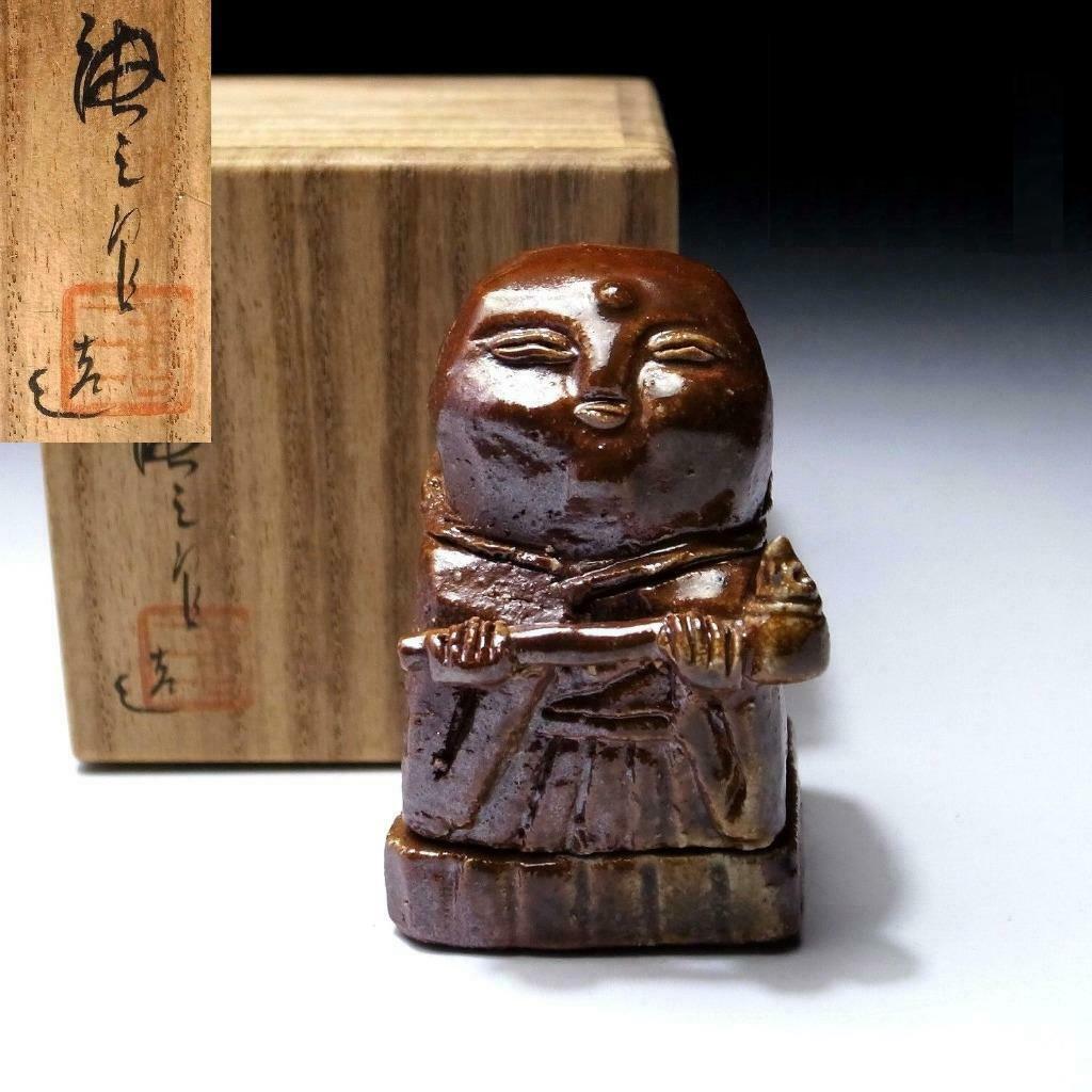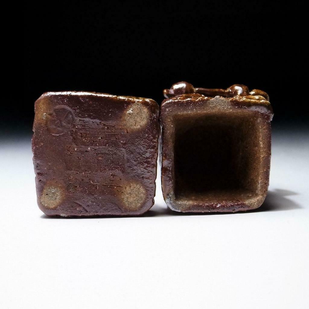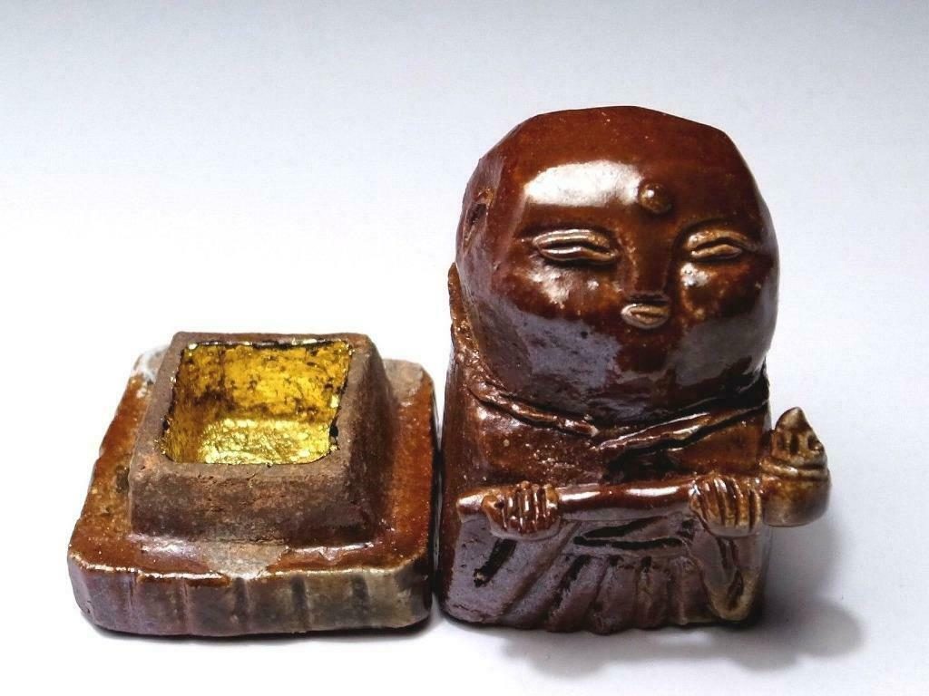 This is a cute kogo or incense case in the shape of monk Jizō (one of the prominent figures in the lore and mythology of Japan), by Kyoto based potter Ryozo Taniguchi (1926-1996). This kogo is quite rare and not many references are available, featuring his early work. Early on he was prolific with a glaze ranging in colour from red to brown, such as the piece here. Later he changed his style to works with blue and green glazes in complex patterns.