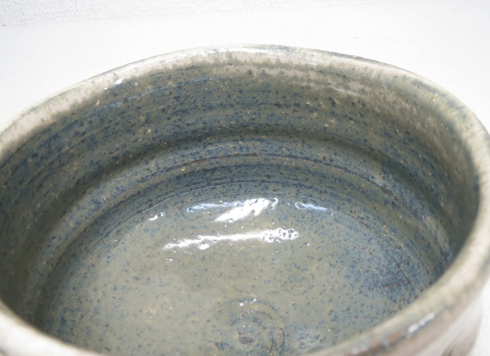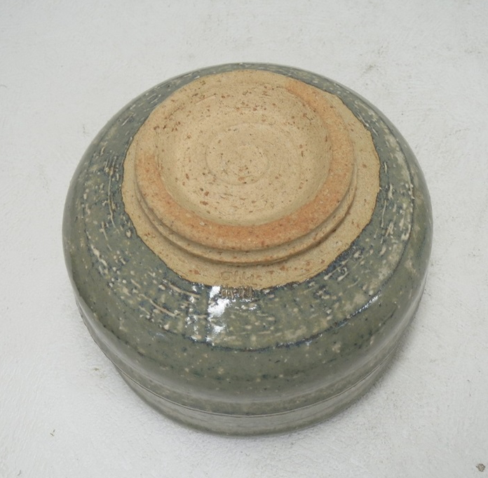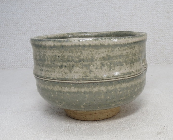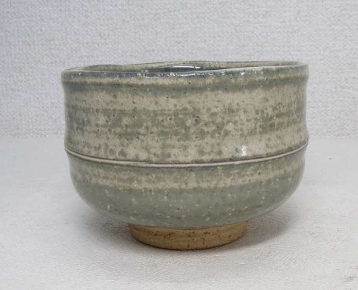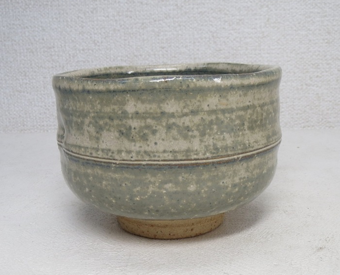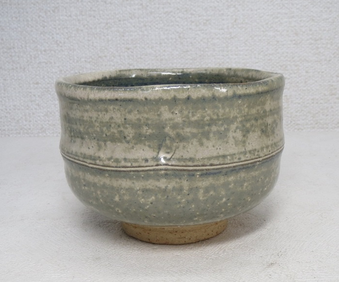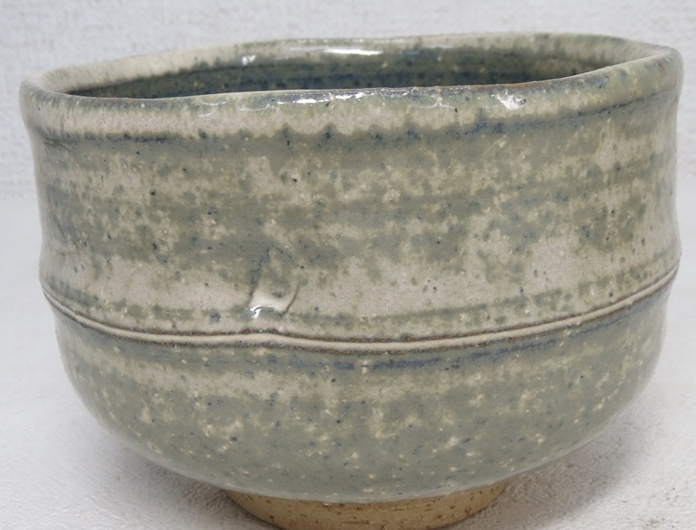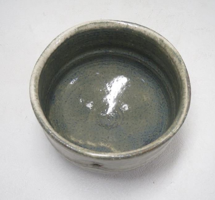 This chawan was made by Kazuyuki Oga (1956-), who was born to the previous generation Hagi potter Kazuyuki Oga (1915-1991). This chawan is clearly modeled after bamboo which is often associated with Japan. Half cylinder shape with a ridge resembling the nodules on the stalks of bamboo. The glaze is a green gray amalgamation that turned out more blue on the interior and rim of the bowl. It has the typical rougher clay that gives Hagi its famous porous quality that instead of being seen as a deficit or flaw gave birth to what is now known and appreciated as the 7 stages of Hagi.