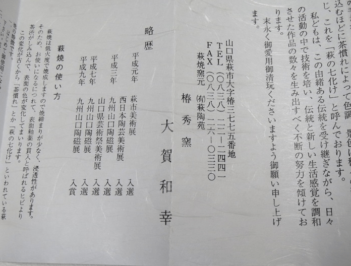Hagi-yaki was a so called Otome yaki and was produced for the household of the Daimyo of Hagi only and was never sold to the general public.
