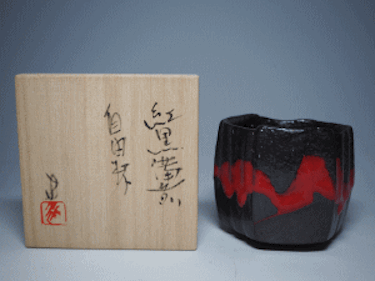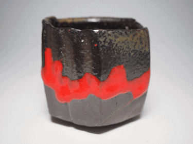 Of exceptionally high quality kuro – black Bizen with a striking design in his red glaze. This yunomi was made by Bizen potter Kenji Takenaka. Hexagonal in form, the six sided are shaped to create three smooth and three ribbed surfaces. This ex jeweler made the switch in the middle of his career and is now a full time potter. Please see the following summary of his life. I dare say this cup has some of his best workmanship available and holding and using it it will be very clear why even even though starting potting late in life, he is now highly acclaimed.