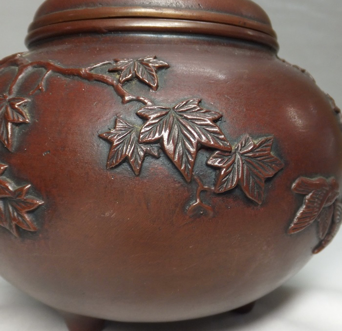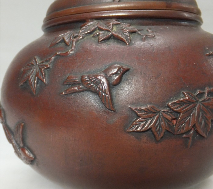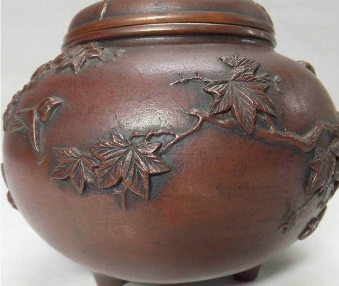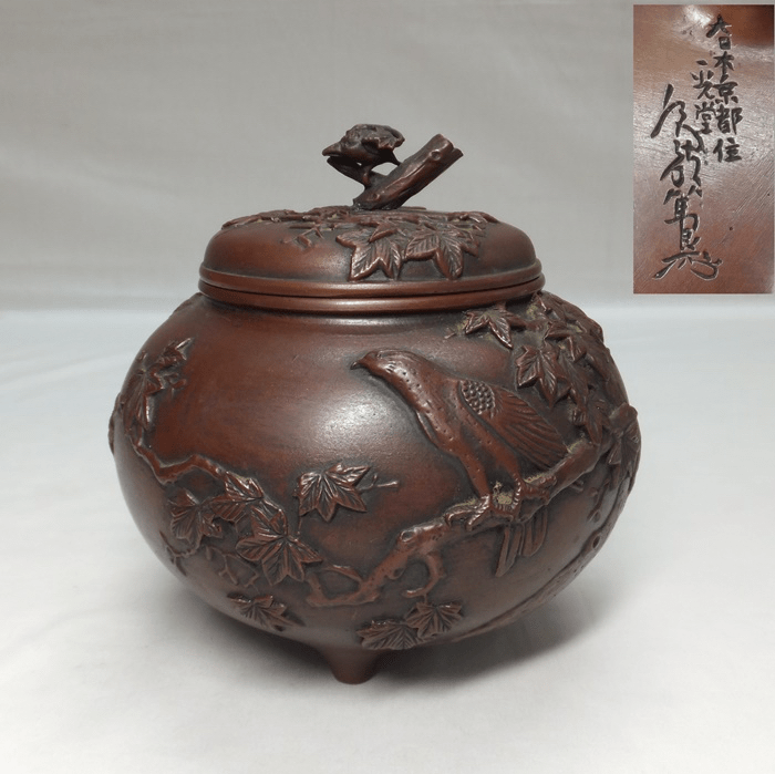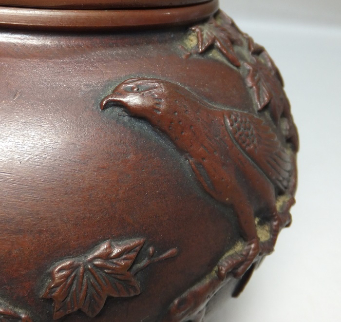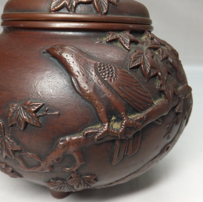 This uncommon copper incense burner was made by Miyabe Atsuyoshi, who was one of the most prolific and greatest metalworkers of 20th century Japan. It is large and heavy, featuring a nature scene of a hawk observing smaller birds amongst the leaves and branches. The knob on the lid is a small bird that appears to be hiding under foliage, it is undoubtedly aware of the hawk. A finely decorated incense burner created from high quality metal and is unusual for this artist. The piece has gained a very nice patina over the years and needs to be cherished.