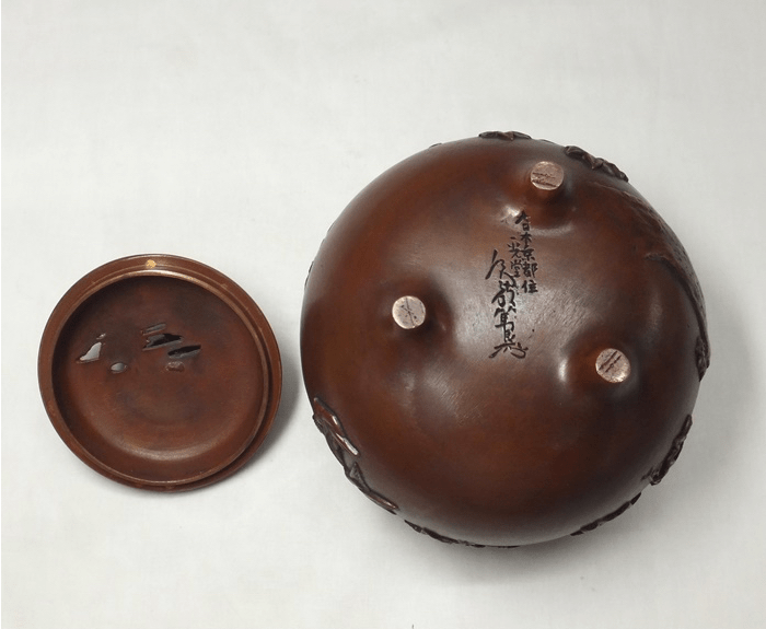 Condition is excellent and patina exquisite and original. It does not carry any smell which means it most likely had not been used before I purchased it. Signed on the base with chiselled characters ‘Dai Nihon Kyoto no ju Ikkodo Miyabe Atsuyoshi 大日本京都住一光堂宮部篤良’ with a kao. Does not come with a box. I can provide a soft quality fabric cloth to ensure this piece is protected at all times when not in use or on display. An uncommon incense burner from one of the greats.