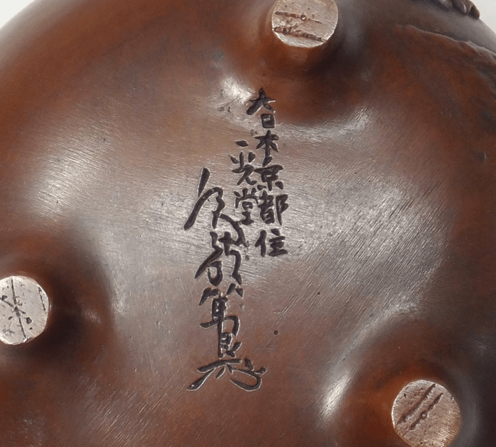 Miyabe Atsuyoshi was master bronze smith who lived in Kyoto. He exhibited domestically and internationally at the turn of the twentieth century. Of note is his entry in the 1904 World’s Fair, held in St. Louis.