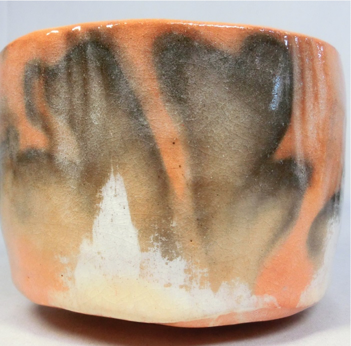 The areas of smoky black, which are hidden by the coating of white glaze, are known as ‘fu’, and are seen on traditional aka-Raku. Fu is a colour change which occurs when fired surrounded by binchotan charcoal produced from Japanese Ubame oak. In other words, it is the burn mark created by binchotan. The surface of aka-Raku is like canvas fabric and the unique black designs of binchotan appear during firing in the kiln. Superb fu depends on the quality of binchotan charcoal and the skill of the craftsman to control the kiln’s fire.