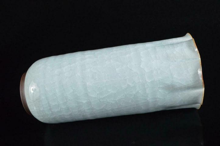 This exquisite celadon vase was made by the famous Kutani artist Kitamura Takashi (1946-). This vase is shaped alike the lotus flower with 8 fluted points on the rim. The celadon crazing shows long streaks from top to bottom with multiple layers of intertwining crackles connecting them in between. Celadon pieces are not often seen by this potter and he works in the more typical styles of Kutani.