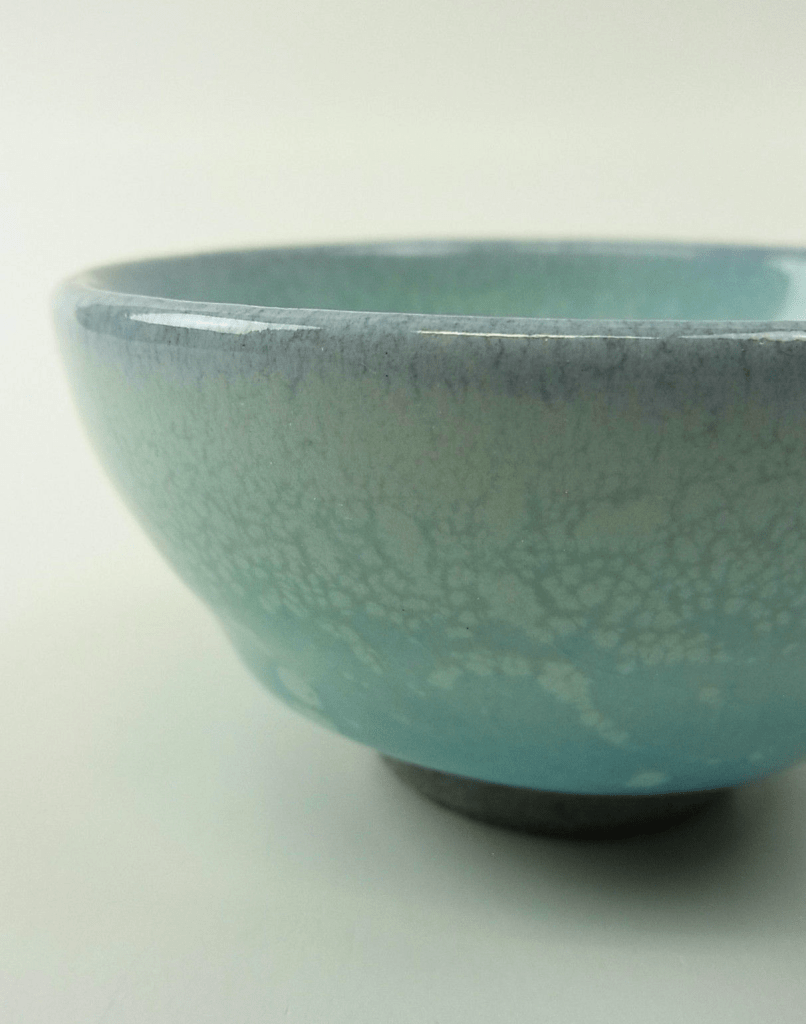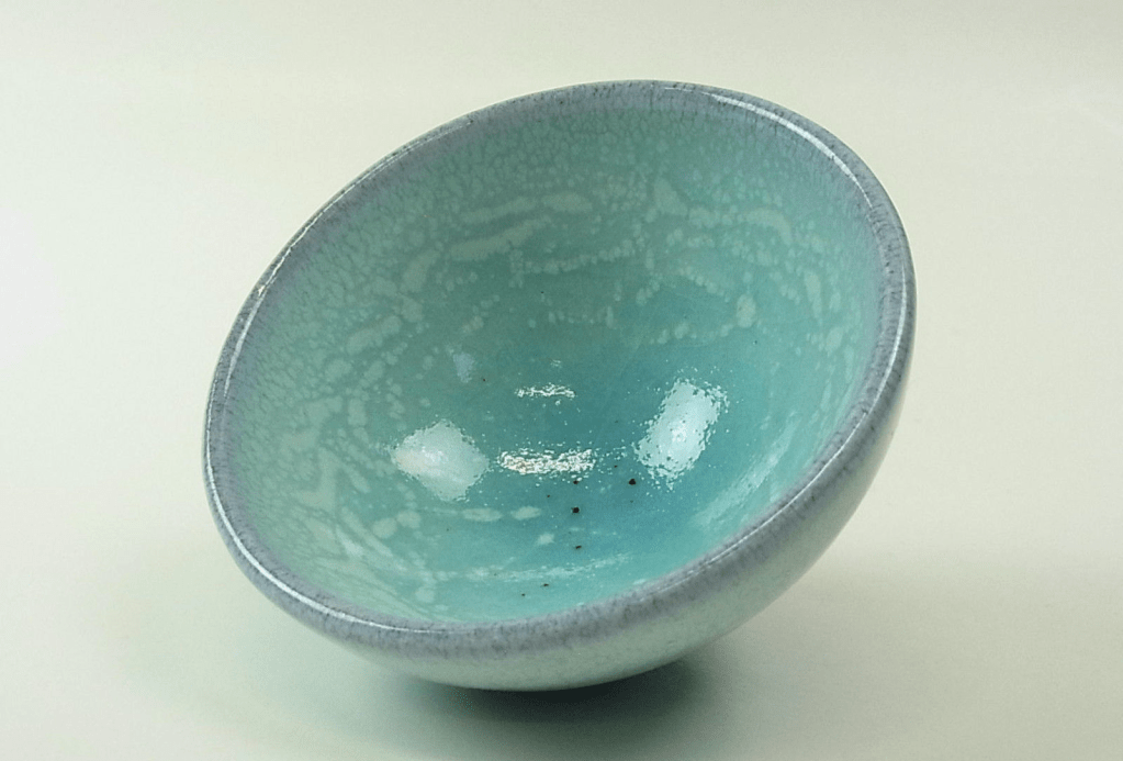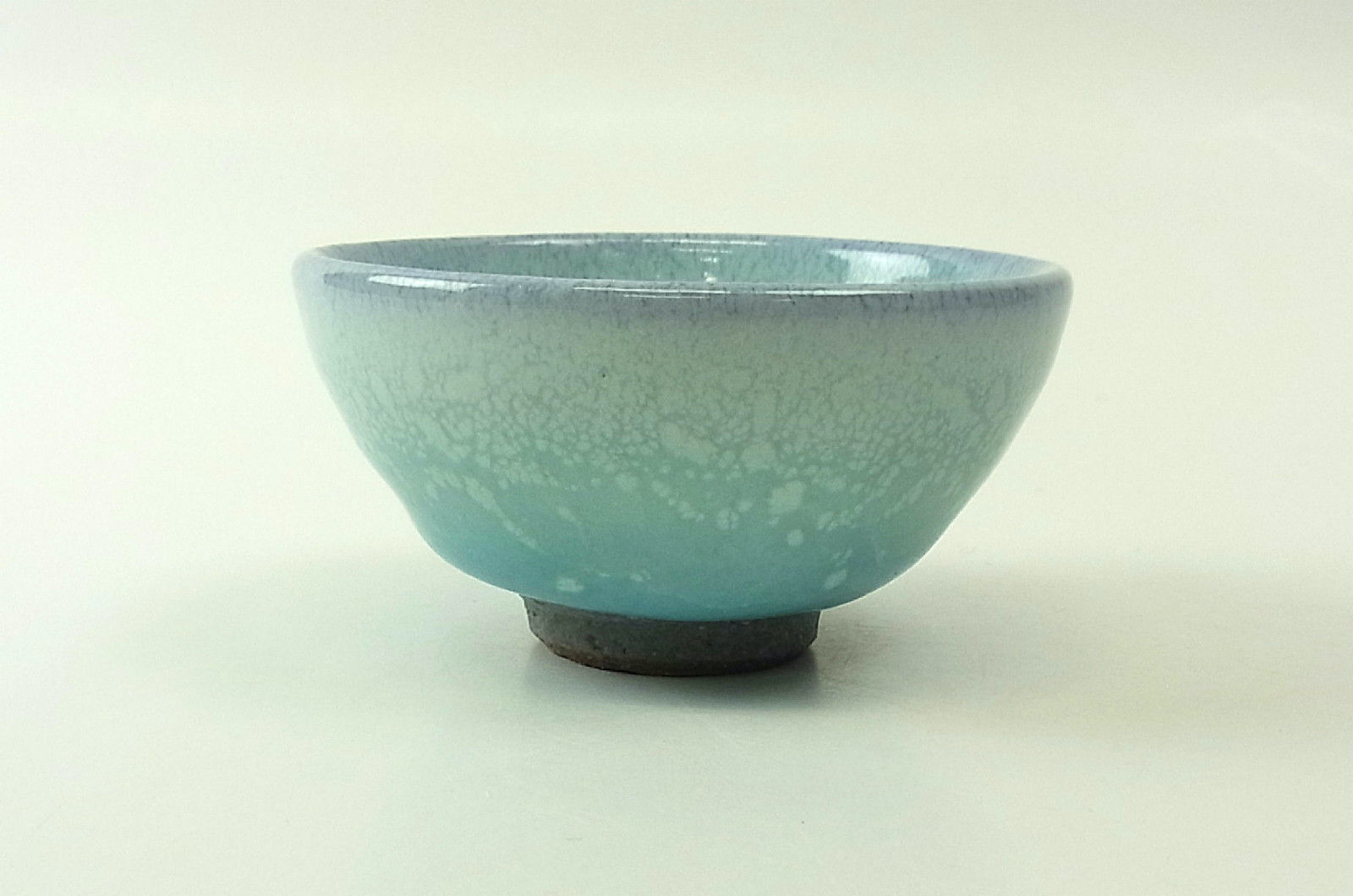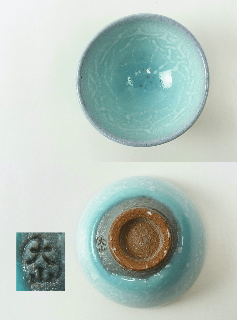 This shinbashi-iro – turquoise oilspot guinomi, saké cup was made by the now retired potter Suzuki Toshiyuki (1944-). He build his own kiln in the seventies and a climbing kiln titled Kuko-gama in 1981. Besides being a well regarded artist he is also accredited with the revival of Daisen ware. He received the title of ‘Dentou-Kougei-shi’ for his work, which loosely translates to title of ‘traditional skill holder’, in Tottori prefecture.
