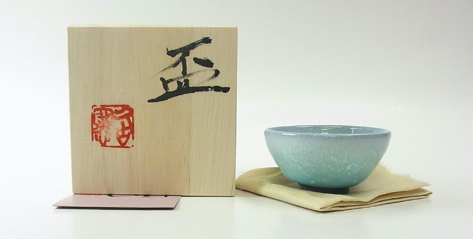 The guinomi is unused and sealed by the potter. There are no chips or cracks and condition is mint. Comes with the original paulownia tomobako, storage box with kiln stamp and calligraphy on the lid, a pamphlet with additional information and a dedicated tomonuno or tea cloth.