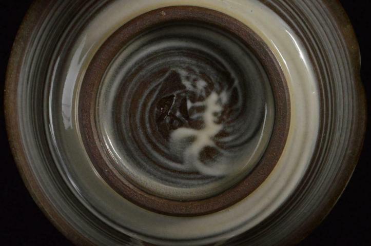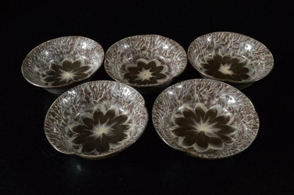 Works by the 13th Yokoishi Gagyu are known for the sense of movement, flow and perfect balance of visual weight in his designs. Meticulously shaped with indentations on the rim these pieces emit a quiet but unmistakable air of sophistication. The clay once dried to leather hardness was covered in white slip and manipulated by brush while wet. This set is in a style seldom seen and more commonly encountered are designs of egrets and the characteristic theme of flora taken by the wind. The flowery motif seen here is more quiet or natural if you will and rarely seen in my experience. When holding one of these pieces it speaks to a different kind of quality, one that is seemingly less and less common in today’s world.