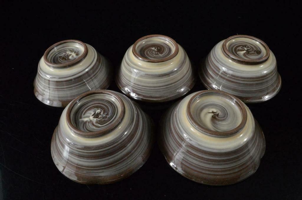 All five have a carved signature on the bottom and at the same time the signature is also present in white slip, seemingly written at the slip’s point of origin, with brush strokes overlapping the carving. Highly unique and uncommon. In more than a decade this is the only time I’ve come across this a type of double or overlapping signatures.