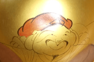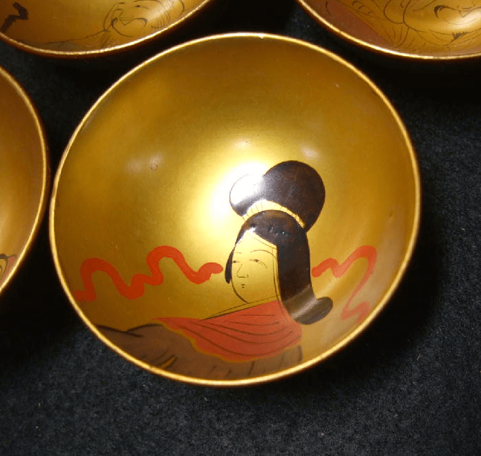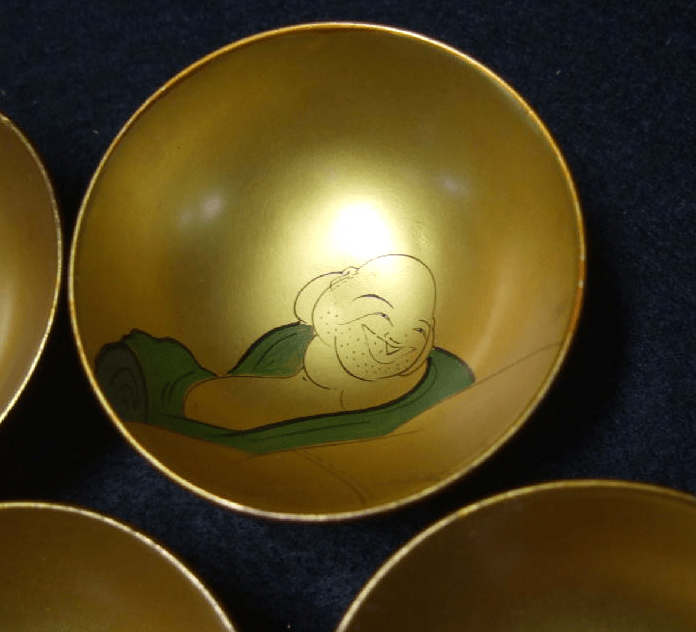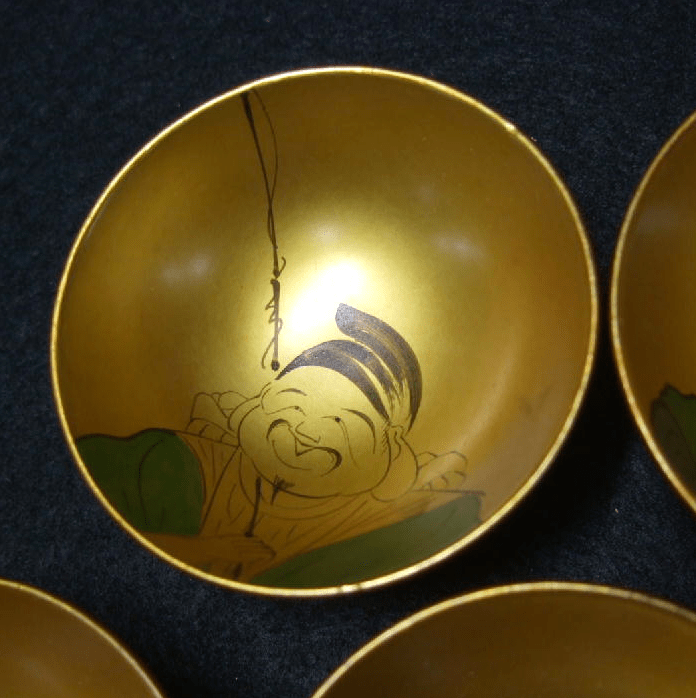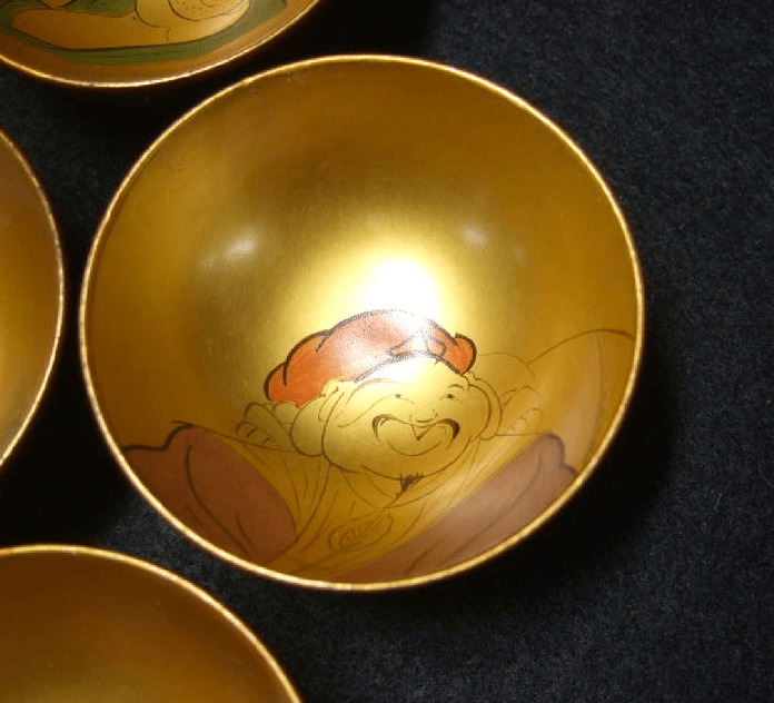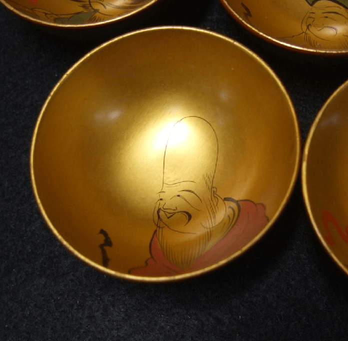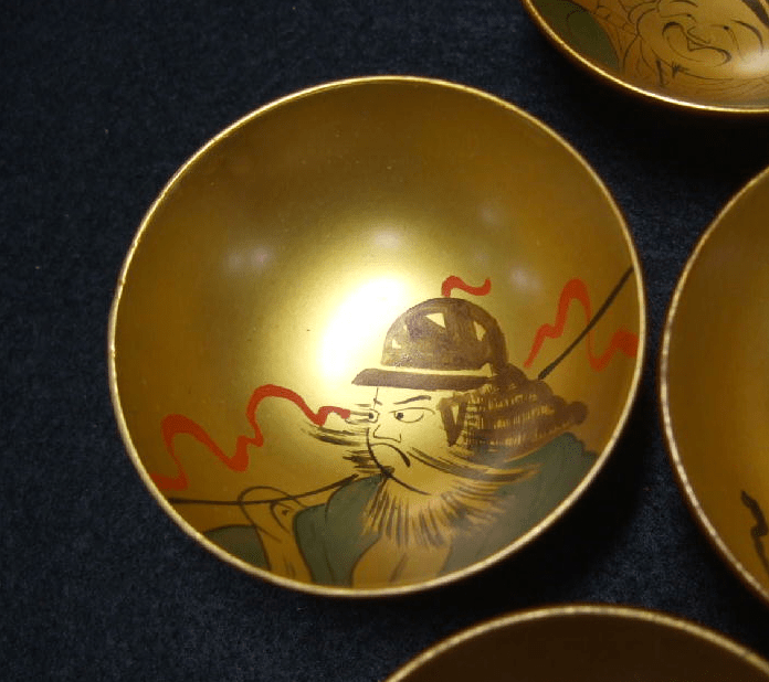 This is an antique set of 7 lacquered wooden guinomi or saké cups. The cups in this set have charming lacquer work in a theme that I’ve always found intriguing. The Japanese Seven Lucky Gods. These Gods are an amalgam of figures from Hindu, Taoist and Shinto religions representing Indian, Chinese and Japanese cultures. There are similarities between the 7 Japanese Lucky Gods and the 8 Immortals of Chinese lore, and originally the myths from China served as their basis. They are named Jurojin, Daikoku, Fukorokujo, Hotei, Benten, Ebisu and Bishamon. Curiously Ebisu is the only one native to Japan and the Shinto religion.