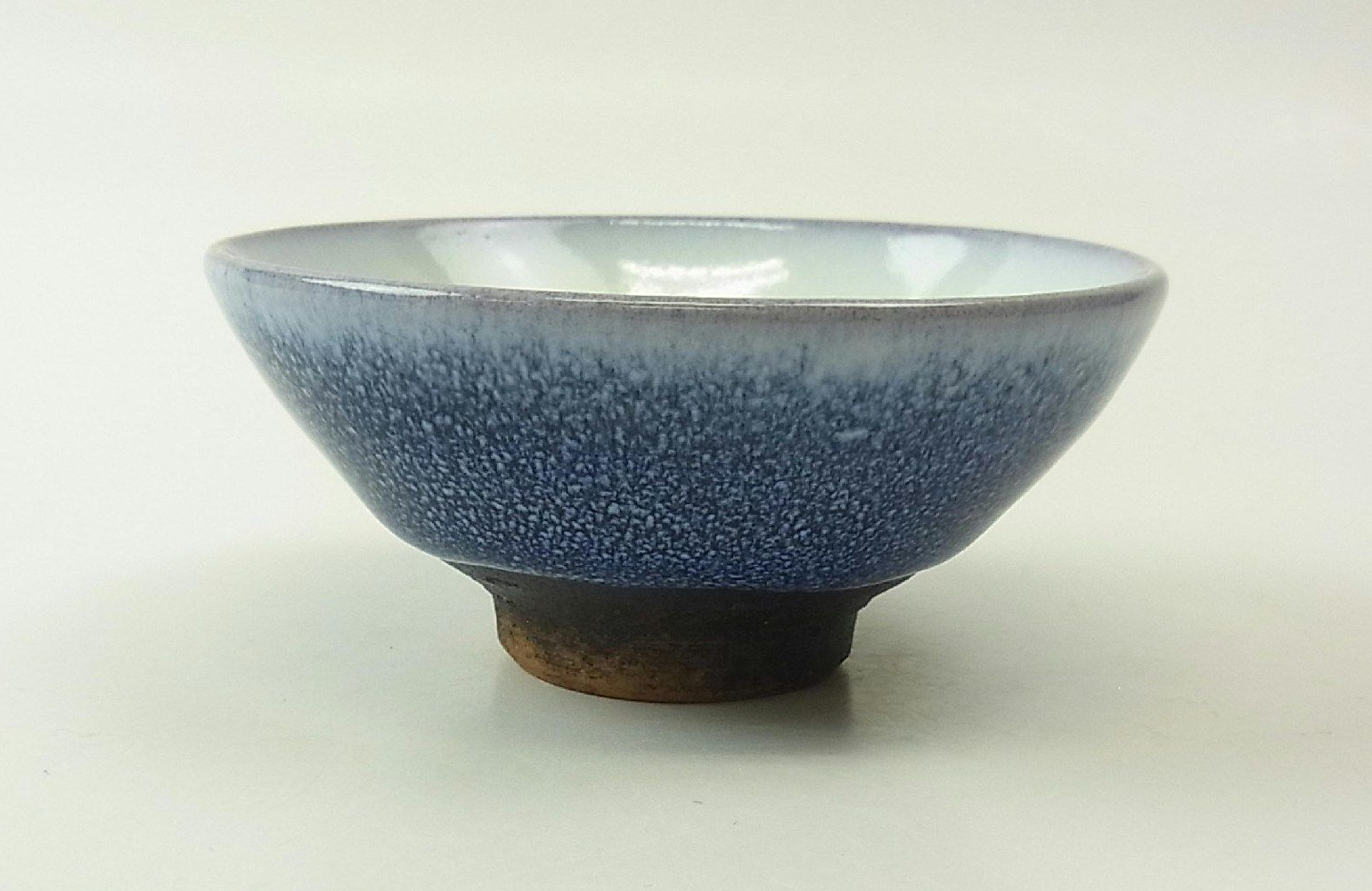 This stylish tenmoku or oil-spot guinomi, saké cup was made by the now retired potter Suzuki Toshiyuki. For me this cup has that unique look of guinomi of the Edo period, low and wide. It was coated with a vibrant blue oil-spot on the outside with a clean white glaze on the inside. Suzuki Toshiyuki is accredited with the revival of Daisen ware. He build his own climbing kiln in 1981 and named it Kuko-gama. He received the title of ‘Dentou-Kougei-shi’ for his works, which loosely translates the title of ‘traditional skill holder’, of Tottori prefecture. This guinomi is an excellent example of one of this artists main area’s of focus.