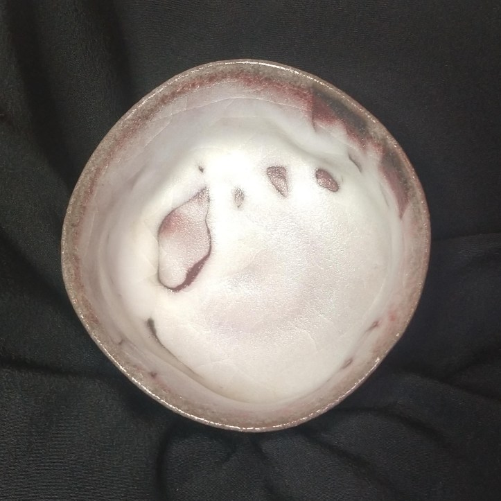 This vase was made by famous potter Zenko Yasuda (1926-2011). It bears a very strong resemblance to his submission (also a vase), with which Zenko Yasuda broke trough at the famous Nitten Exhibition. This work is a slightly larger compared to the aforementioned vase and in person looks much better than the photos. The white glaze, which reminds of a Shino feldspar but with more intricacy – comparable to a type of celadon, partly translucent and intricate. It has many of the same qualities as the chawan shown on the right and for which a more expansive description can be found here.