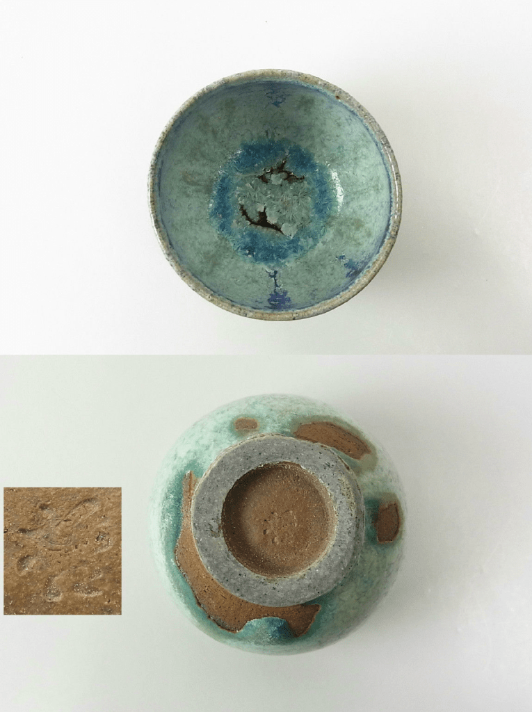 This guinomi was discounted when acquired because during the firing the glaze dripped and connected with the firing brick it was set upon. This ‘forceful’ break was the reason for a relatively large reduction in price compared to similar guinomi (the part affected by this can be seen on the right at the rim of the koudai or foot). It is curious to note it has not much to do with the outcome of his specialty; his Galaxy glaze, of which he has a very high level of control.