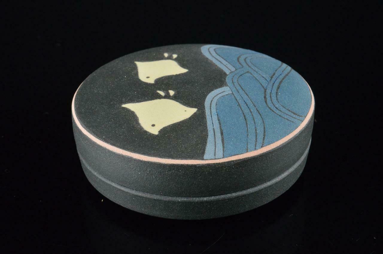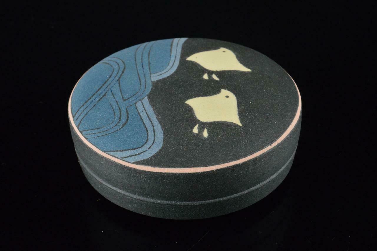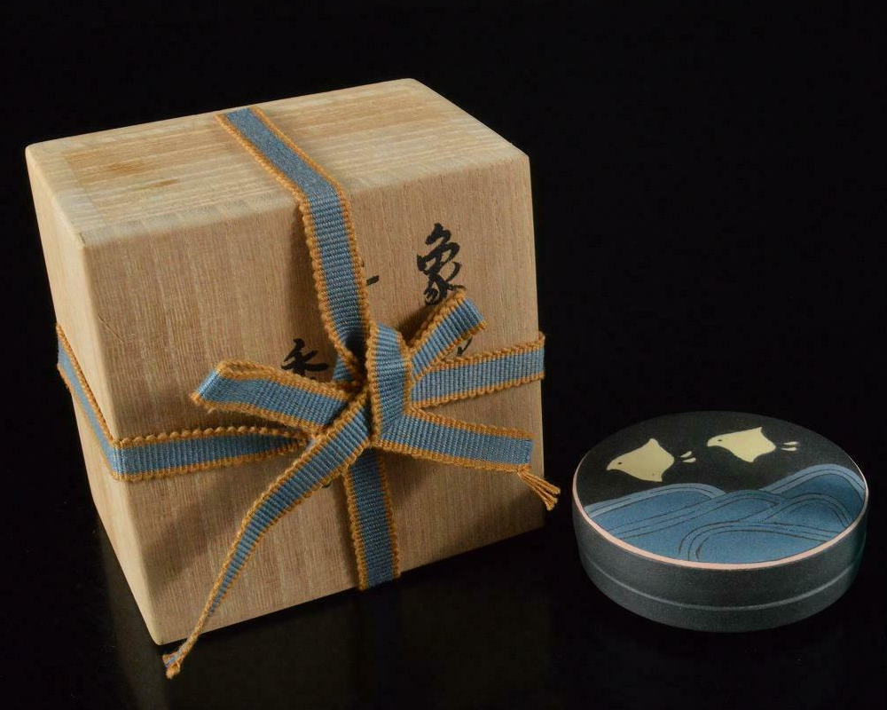 This cute kogo or incense container was by the famous Kutani artist Kitamura Takashi (1946-). Kitamura Takashi works in all the styles Kutani ware is known for. Here white and blue are inlaid in the form of birds and waves on the lid. This motif was also the subject of several famous works by ukiyo-e master Hokusai.