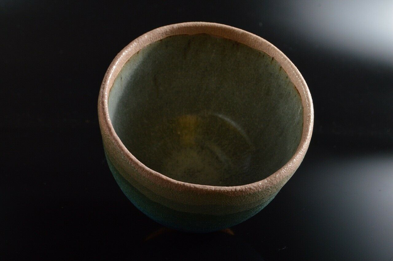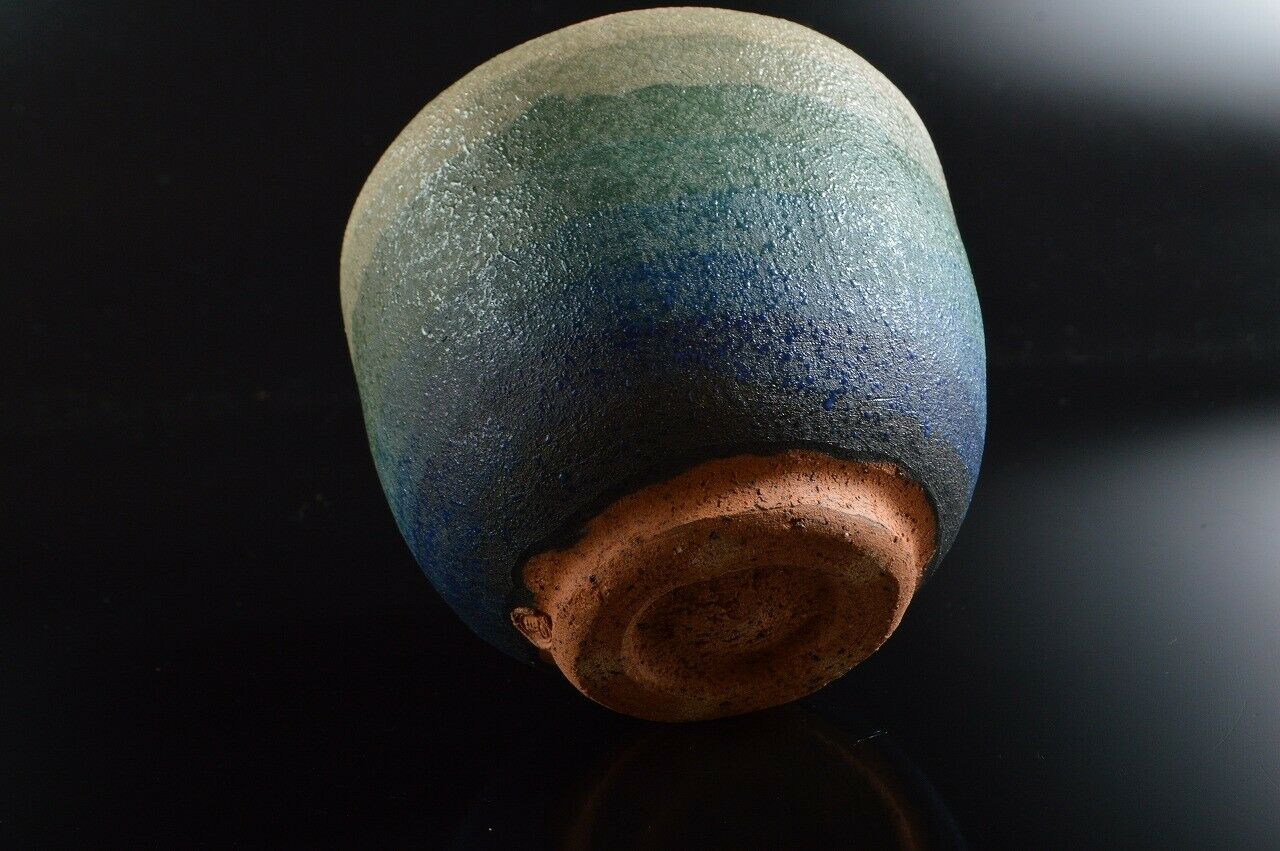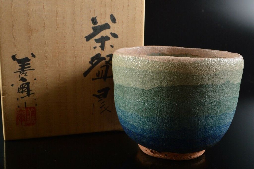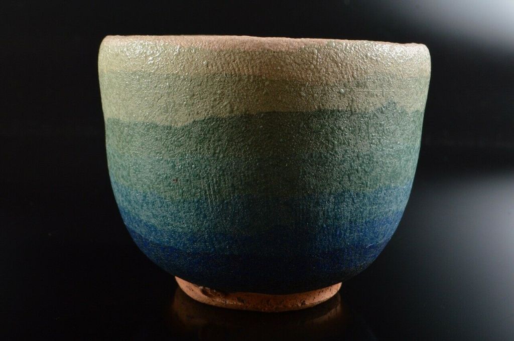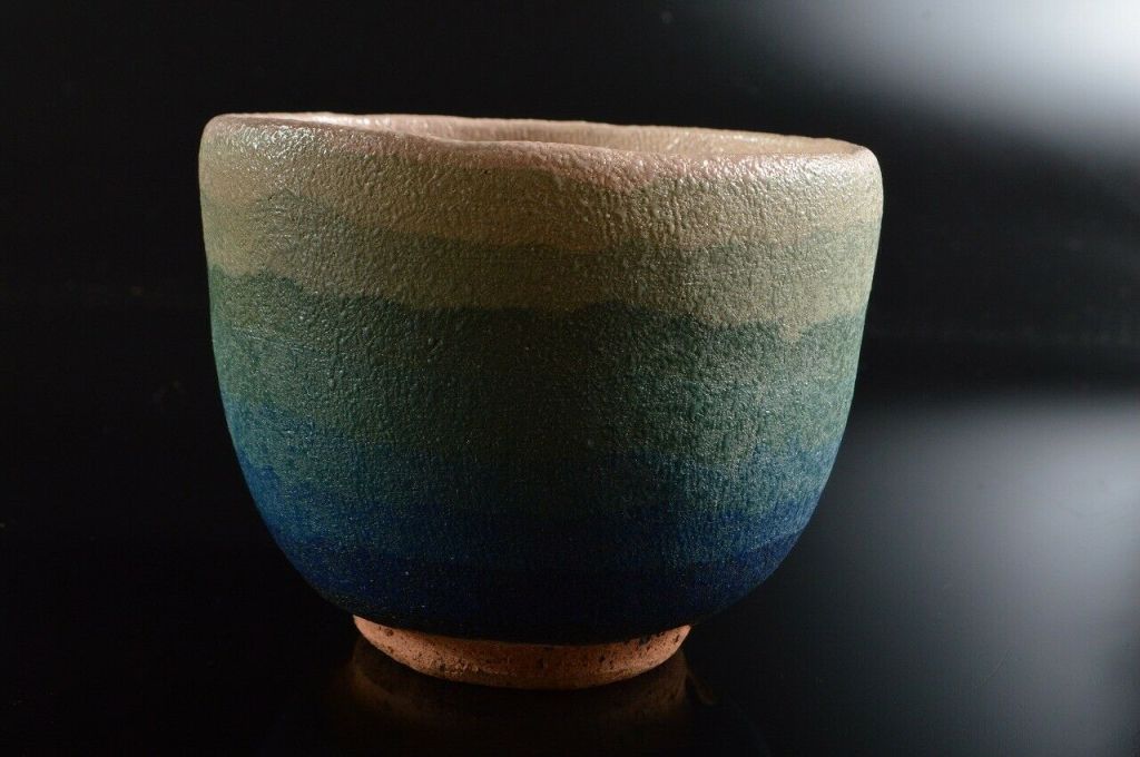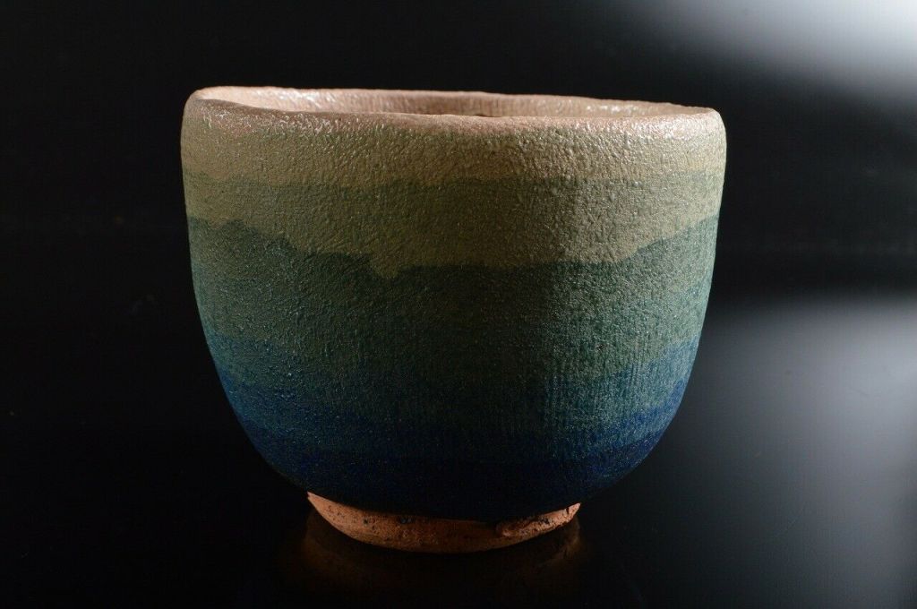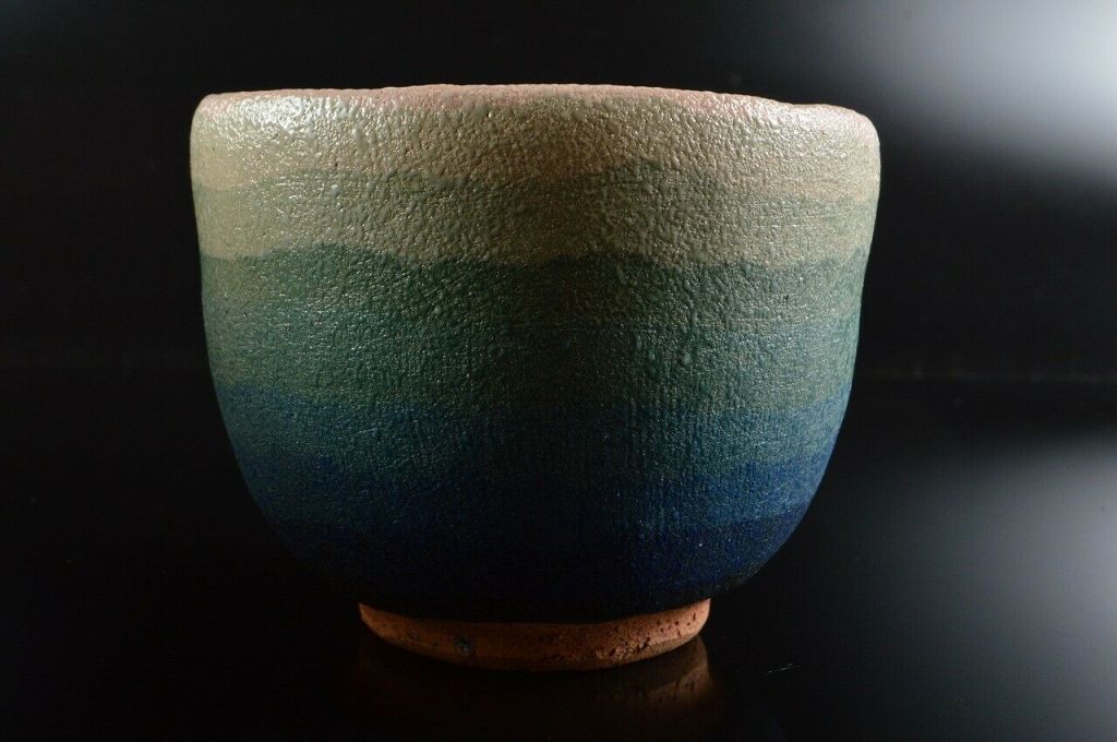 This is a rare and valuable chawan by the distinguished artist Miyashita Zenji (1939-2012). As the eldest son of master potter and porcelain artist Miyashita Zenju (1901-1968), he went to Kyoto Municipal University of Arts and studied under the Living National Treasure potters Tomimoto Kenkichi and Kondo Yūzō. This chawan was made with the saidei technique (coloured-clay overlay). Saidei is the technique in which Miyashita Zenji applied extremely thin layers of delicately gradated coloured clay in irregular bands to cover the surface of each sculptural vessel or form, transforming the surfaces into distant hills, drifting clouds or rolling waves. From what I’ve seen it seems that most of his works, especially saidei work were vases, where there is more surface area to work with. In this case there are numerous layers applied on a simple looking form. The colour gradient of this chawan seems to be depicting land and sea.