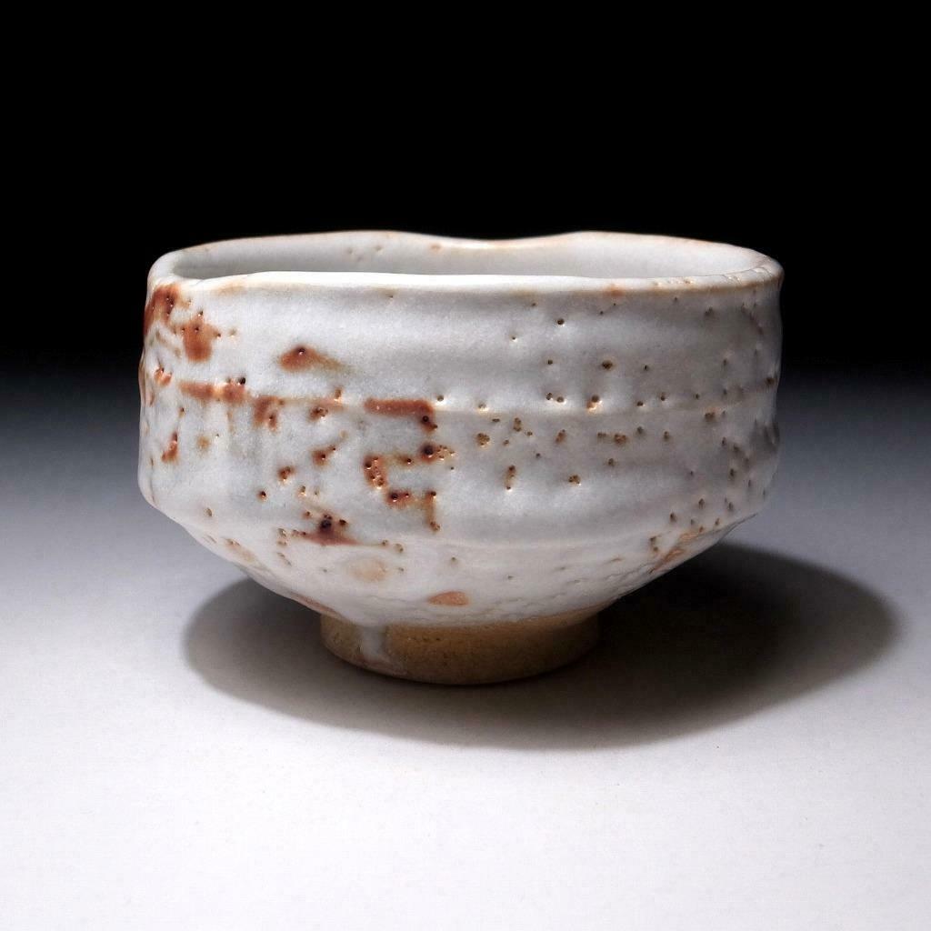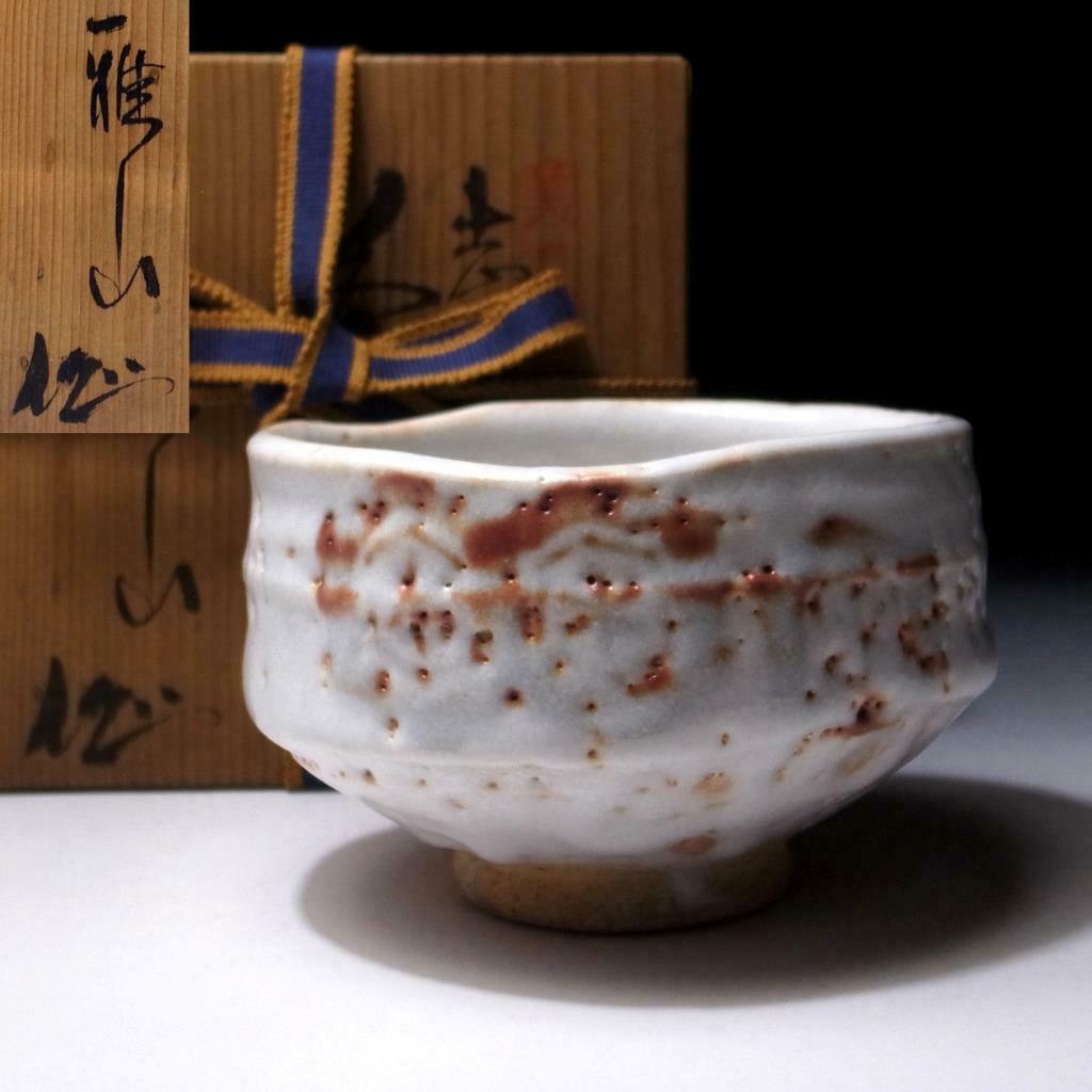 This is a flawless Shino chawan by one of stars of Gifu prefecture, Intangible Cultural Treasure potter Masao Nakajima (1921-). He studied under master Hineno Sakuzo (1907-1984), after which he went independent. Working from his kiln Gazan-gama in Gifu prefecture, he received the title of Human Intangible Cultural Treasure of Toki City in 1987. He worked in an amazingly wide range of styles, including but not limited to: Shino, guro-Seto or black Seto, ki-Seto or kuro hikidashi-Seto (yellow Seto), oribe, over-glaze enamels and at one time even produced Goryeo-style celadon porcelain. His tea bowls are well regarded and this particular chawan substanciates the notion.