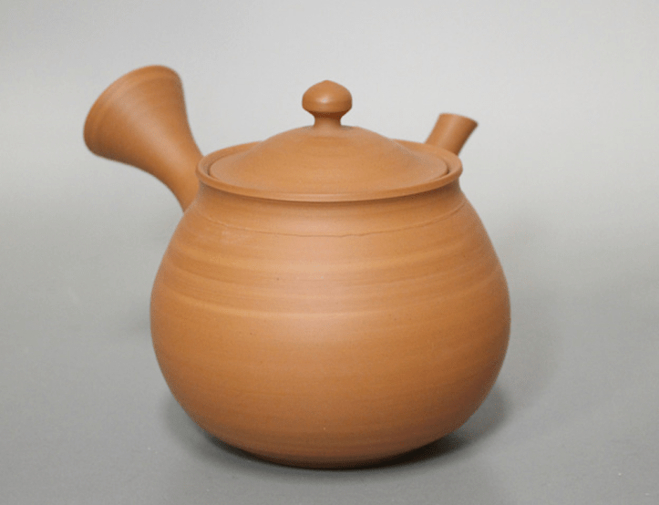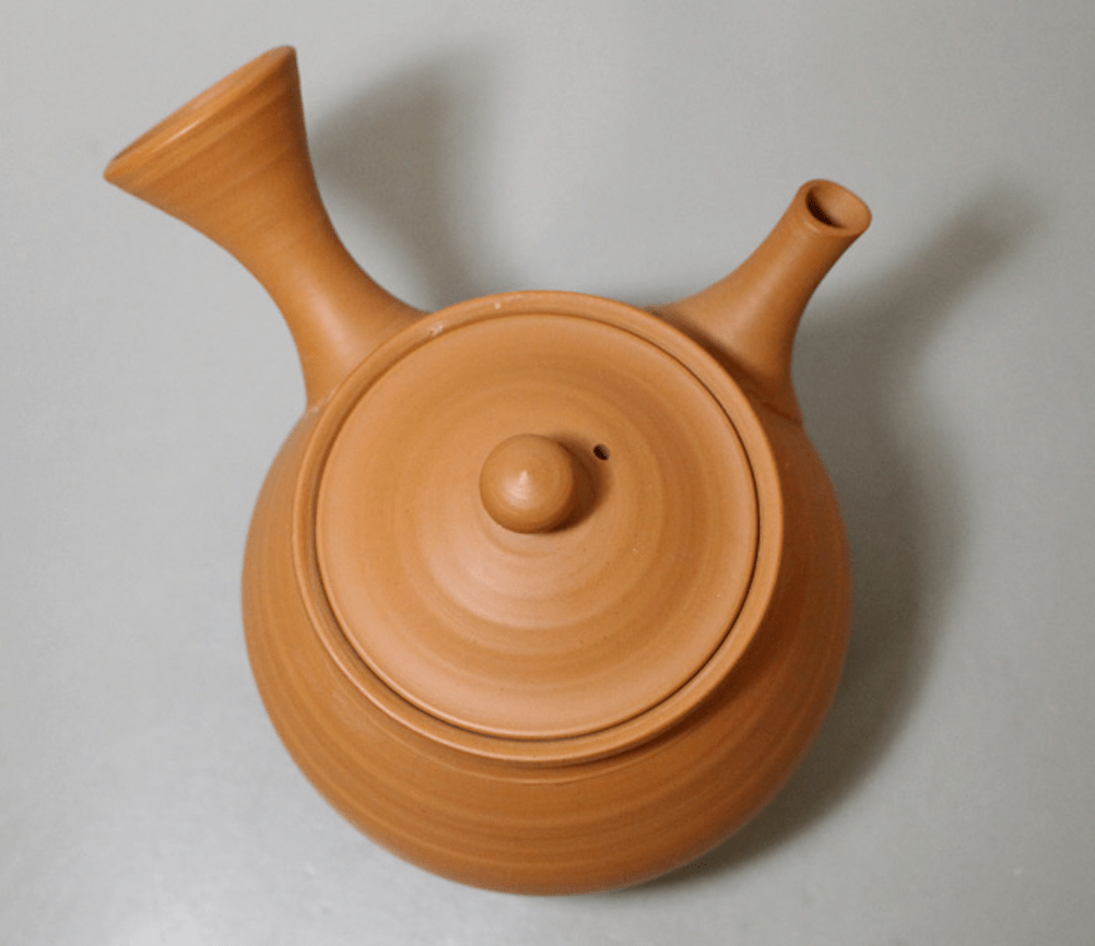This is a special, relatively large Tokoname kyusu or tea pot by famous master-potter Gisui Kondo (often abbreviated to Gisui). Gisui’s real name is Kondo Yoshikazu and he has been recognized by the government as a Traditional Craftsman. This kyusu is created from honshudei clay, one of the staples of Tokoname ware but these days sparsely available. During the urbanization of Tokoname as was the case in other cities, the new living areas were built on parcels previously used as rice paddies. In old times clay was gathered from under those rice fields. Honshudei clay has become sparse and sought for in modern times. Sometimes potters acquire honshudei clay from old batches that are held in storage and other times when new honshudei clay is sourced in the area. Honshudei clay has a yellowish-brown colour, that turns red during firing thanks to its high iron content and with daily use the surface ages and gradually becomes smoother and shinier. The term ‘sujihiki’ refers to the lines visible on the body, the remnants of throwing the body of the tea pot on the potter’s wheel. The spiraling lines merge into each other, creating a charming tea pot with a plump appearance and snug character.