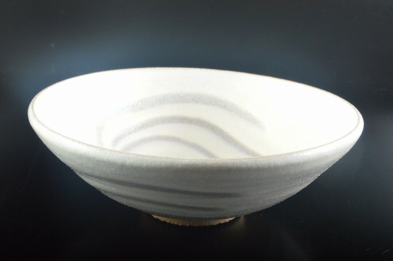 In a more open form compared to a different chawan by Kano Mitsuo. Where the formerly mentioned chawan has a clear tenmoku shape. Here the bowl is made low and wide. One might call this a transition from formal Korean to what we now recognize as a summer type chawan. It has a soft creamy white glaze with what could be called an inverse hakame decoration. Where hakame describes the addition of a brush stroke, often around the exterior and/of interior. Here instead of creating stripes with a brush, here a stroke pattern is added by touching the glaze while turning the bowl. It has a surprisingly soft appearance and when held, a translucent layer that seems to cover the creamy white glaze makes the piece really pleasing.