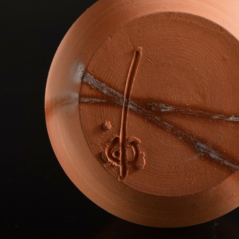 This is a vase by Shunko Nishimura (1886-1953), who’s real name was Yasujiro, bearing his famous double mountain mark. The mark is included in the Bizen Toko (1927), a book on the foremost artists of Bizen pottery. Shunko Nishimura, together with Kaneshige Toyo and Mimura Tokei are the 3 three pillars of Bizen pottery during the first half of the 20th century and are credited with saving it from fading into extinction. His style is traditional but shows great energy and passion as well as a high level of craftsmanship. This particular vase is a good example of ‘hidasuki’ Bizen ware, which is made by binding rice-straw around a piece before firing, resulting in the fire-cords or markings as seen above.