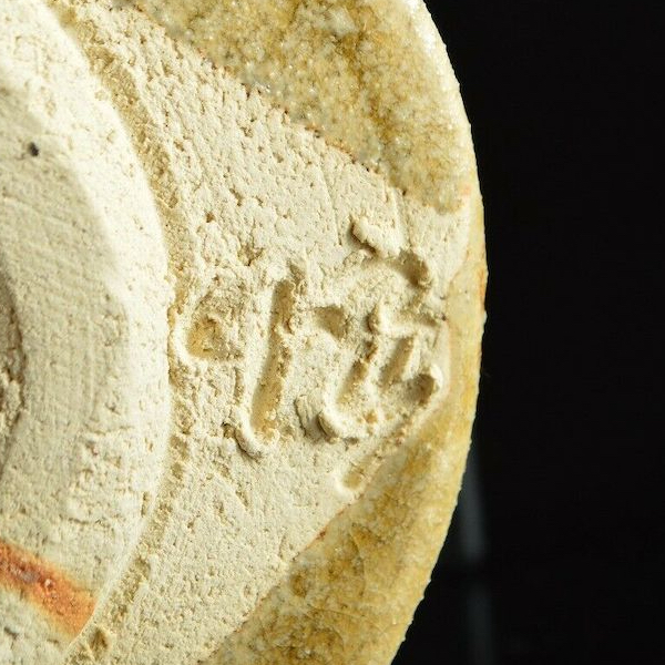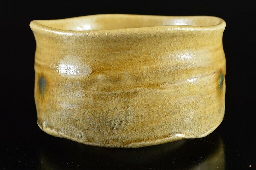 This is a fine ki-Seto chawan or tea bowl by Seto master potter Sho Kato (1927-2001). Ki-Seto means ‘yellow Seto’ and this is an excellent example. From the slightly distorted shape to the fine ash deposited glaze. The glaze that is used for ki-Seto contains only a small amount of iron and produces a yellow colour that can extend to brown. Ki-Seto glaze is often combined with designs or motifs in green. The green surface effects are called tanpan and are one of the highly desirable aspects of ki-Seto ware. It is accomplished the addition a tiny amount of copper sulfate to the recipe. It is the combination of extremely high firing temperatures and the copper sulfate that result in the glassy green surface.