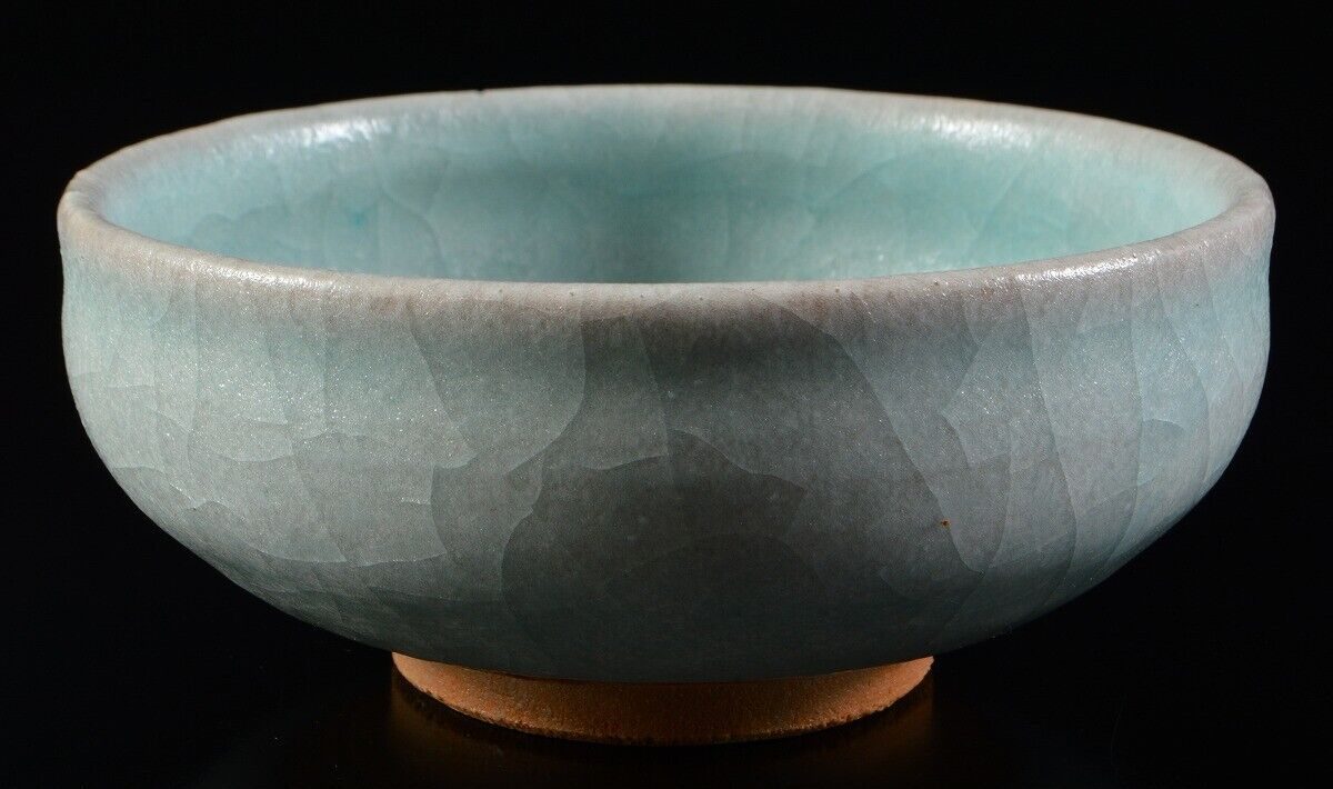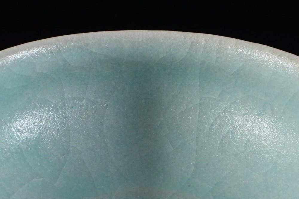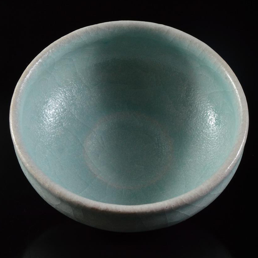 This is a fine chawan by Kyoto master potter Zenko Yasuda. This particular tea bowl’s shape is called ‘badarai-gata’ and denotes a wide and low form. Directly translated though, it means “horse bucket”, -gata meaning shape. The term is said to come from the shape of so called horse buckets commonly seen at horse stables during the Edo period. The glaze of this particular example is similar in appearance to celadon, however Zenko Yasuda is known for having created original and unique glazes of his own and while my feeling is this glaze is created through other elements and reactions than production methods for celadon perse, they share similar characteristics.