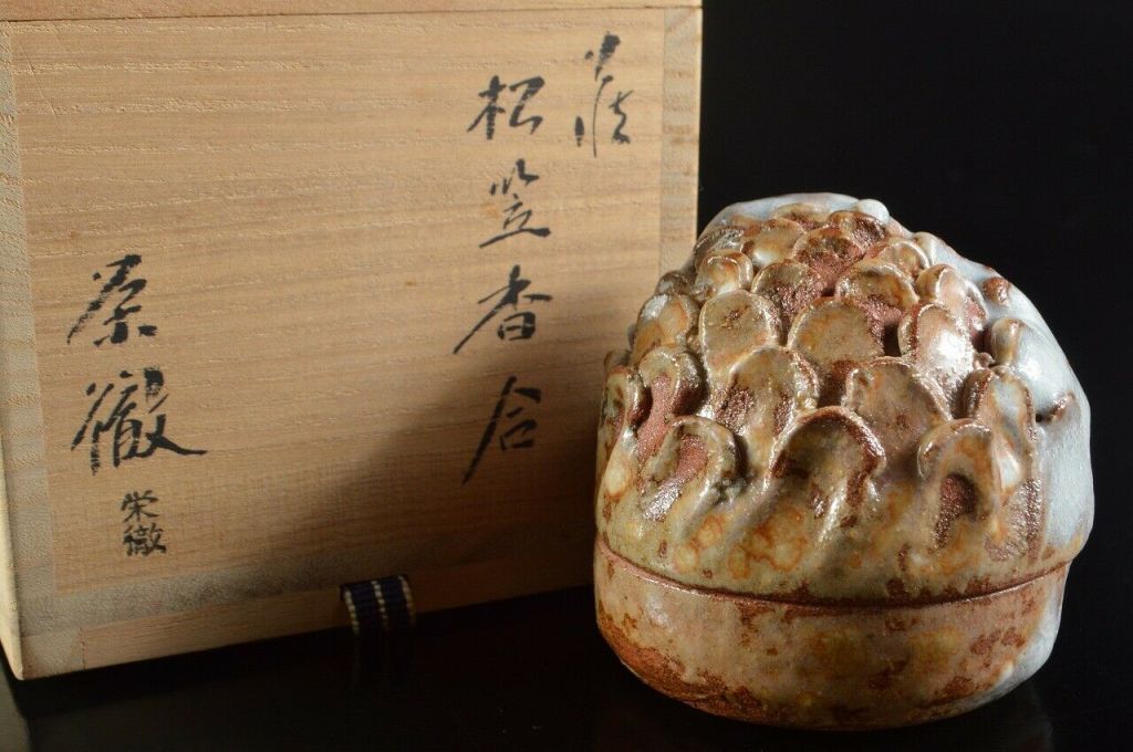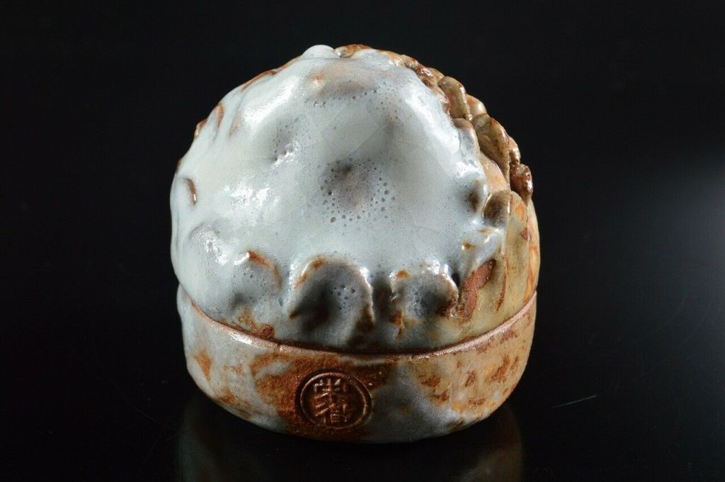 This is a pine-cone shaped kogo or incense container by famous Hagi potter Morishige Eitetsu (1930-2016). Topped off by a white glaze resembling snow this is a particularly fine work that strongly shows the quality of Hagi and pottery in general. Hefty in hand and the glaze shows amazing detail when viewed up close. Morishige Eitetsu was born in Hiroshima, Japan in 1930 and grew up surrounded by pottery. He was a regular member of the Hagi Ceramics Association and was a prolific potter.