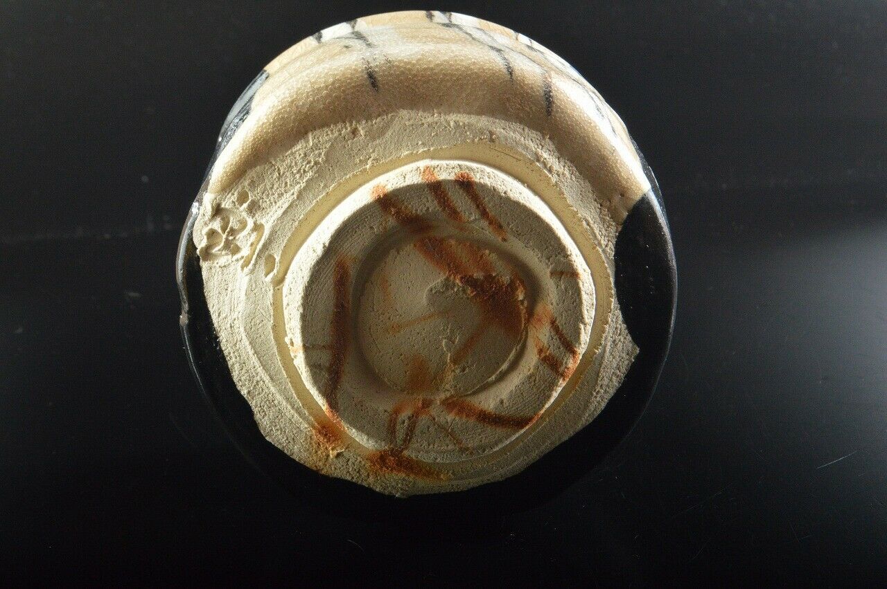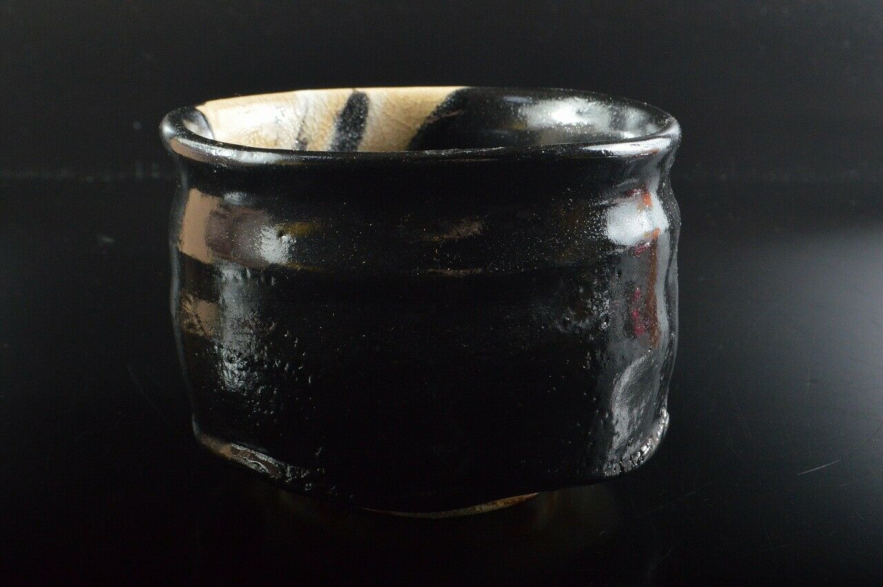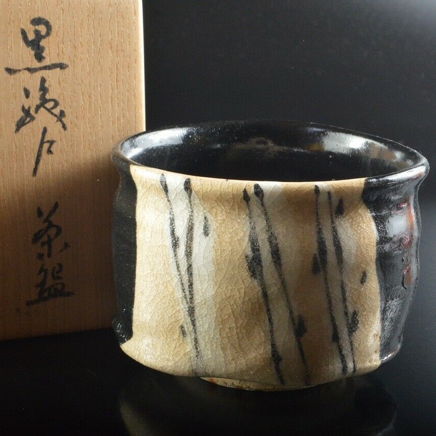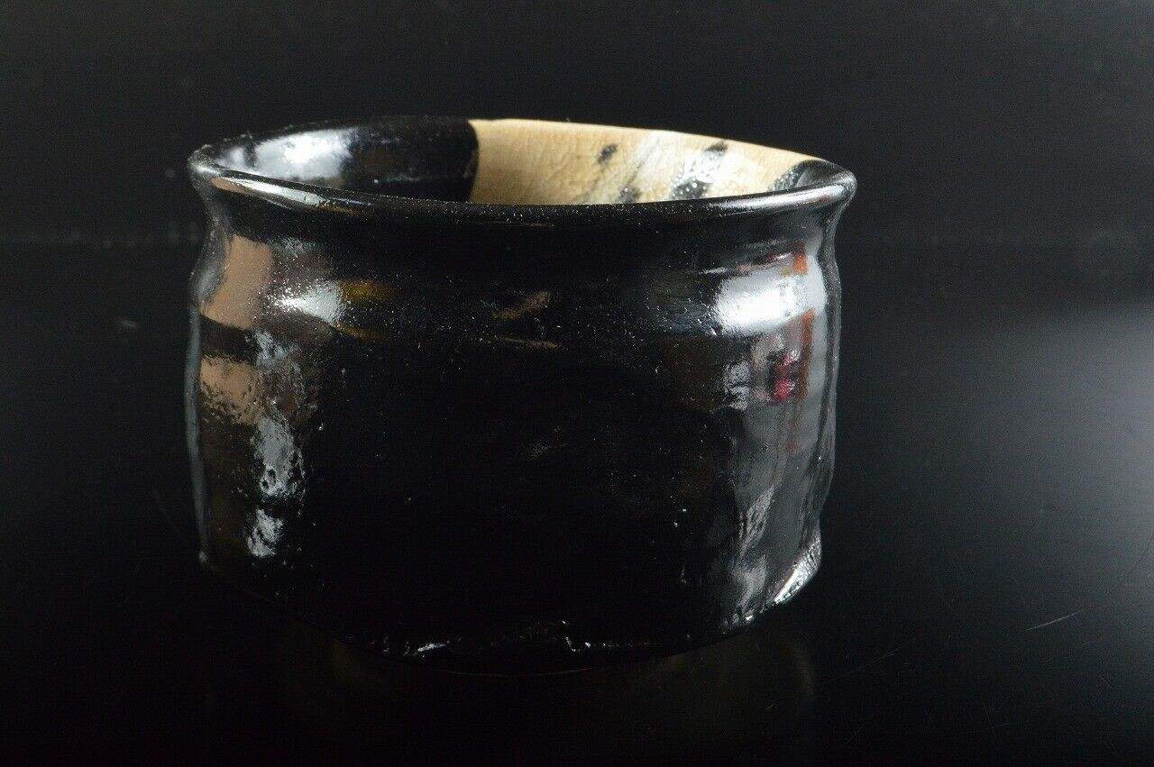 This is a fine kuro or black Oribe chawan, ceremonial tea bowl by master potter Sho Kato (1927-2001). Thrown not so wide as standard tea bowls but not as slim as to be termed tsutsu chawan. Covered with a deep black glaze which contrasts wonderfully with what forms the front of the bowl, showing what I assume to be abstract stalks of bamboo on a off-white backdrop. The glaze is well formed with much details that appear frozen in time (such as the little bubbles that can be seen in the photo above), and has a fine translucency that covers the glaze.