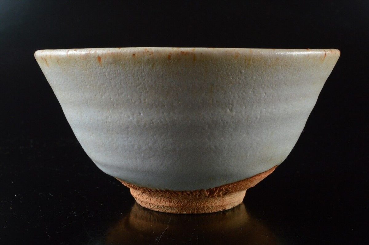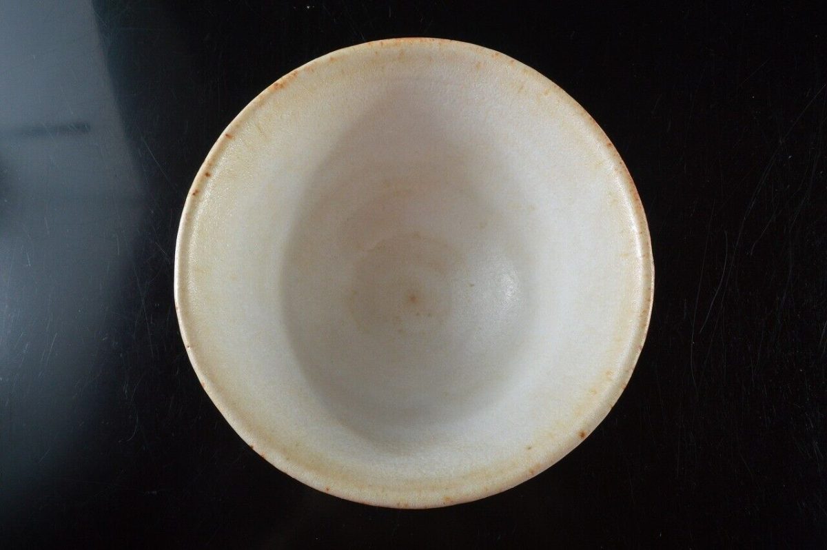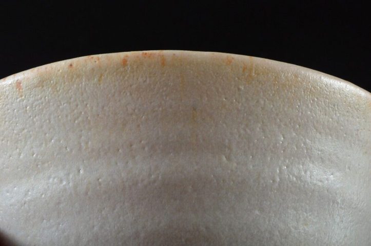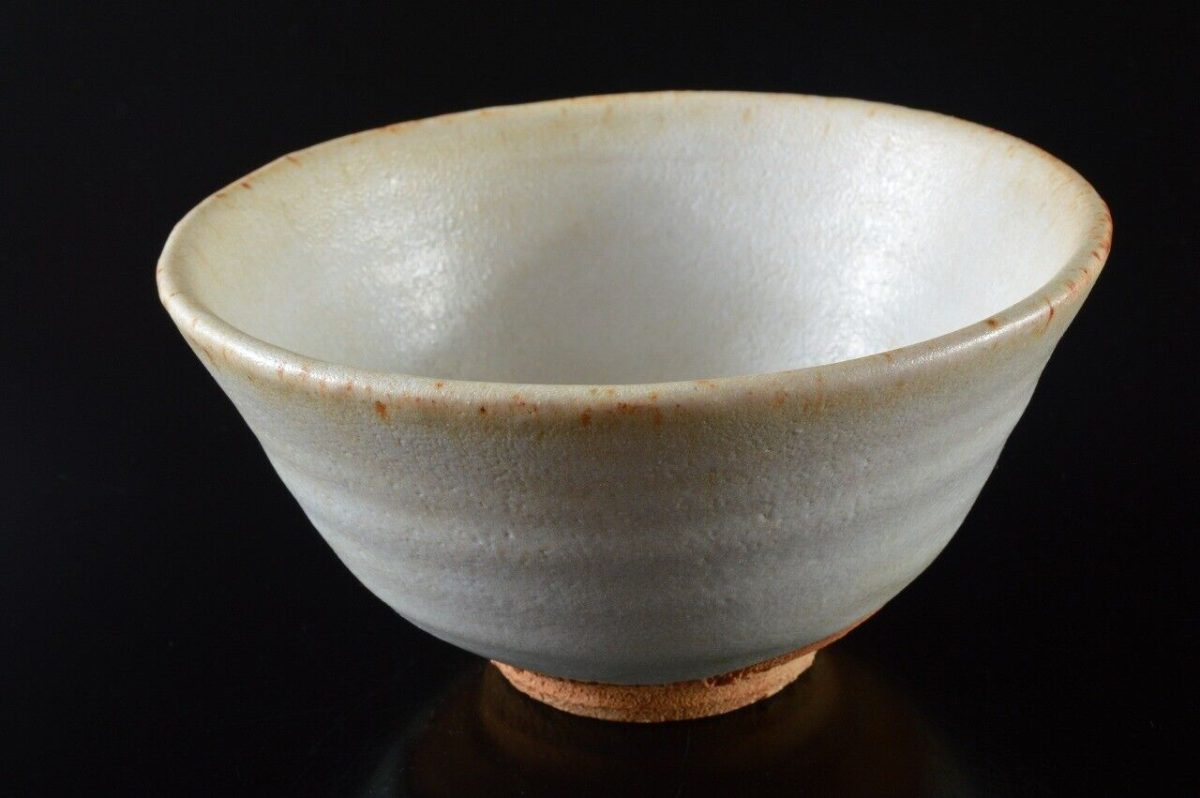 This is a Kyo ware chawan, ceremonial tea bowl with a soft shiro or white glaze by distinguished artist Miyashita Zenji (1939-2012). As the eldest son of master potter and porcelain artist Miyashita Zenju (1901-1968), he went to Kyoto Municipal University of Arts and studied under the Living National Treasure potters Tomimoto Kenkichi and Kondo Yūzō. This bowl appears to be unused and the glaze has a creamy white colour that is quite pleasing and viewed in details has much subtle colour variations. The glaze is irregularly applied around the koudai leaving bare clay. The clay has been textured in such a way that it gives the user grip without having sharp edges or being unpleasing to touch. The bowl has a soft appearance and the little fluctuations in colour and translucency of the glaze make this one chawan to cherish. With use this chawan will sparingly have particles permeate the glaze, leading to the appearance of new details and subtle changes over time.